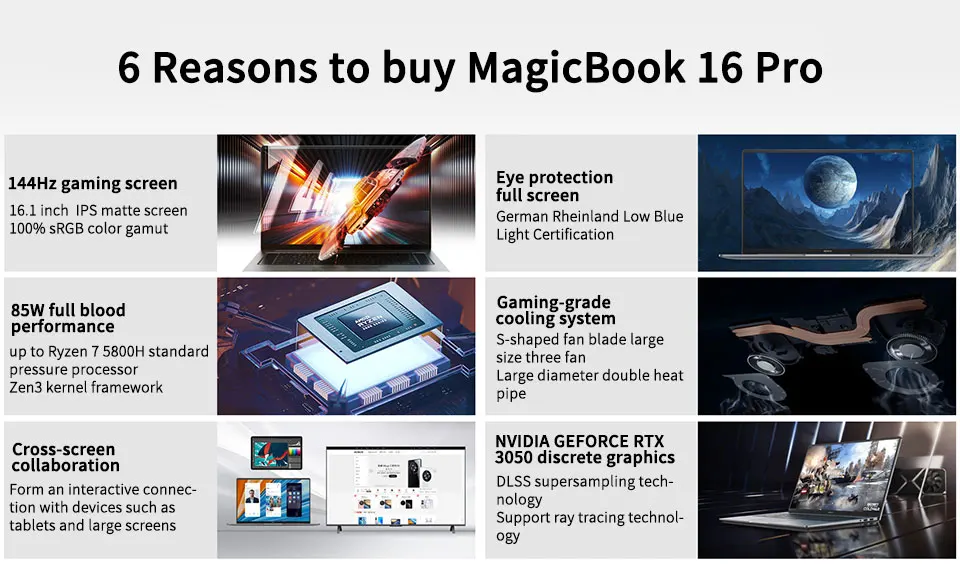 HONOR MagicBook 16 Pro 2021 нарушает традиционный блокнот, а большой экран с эффектом присутствия создает отличные визуальные эффекты. Сертифицированный TÜV Rheinland, он защищает глаза, уменьшая синий светильник и устраняя мерцание.