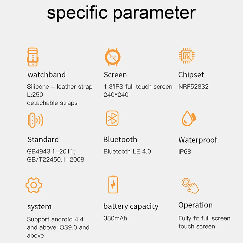 IP68 waterproof, 1.3-inch full-fit high-definition round screen, 7-day battery life.