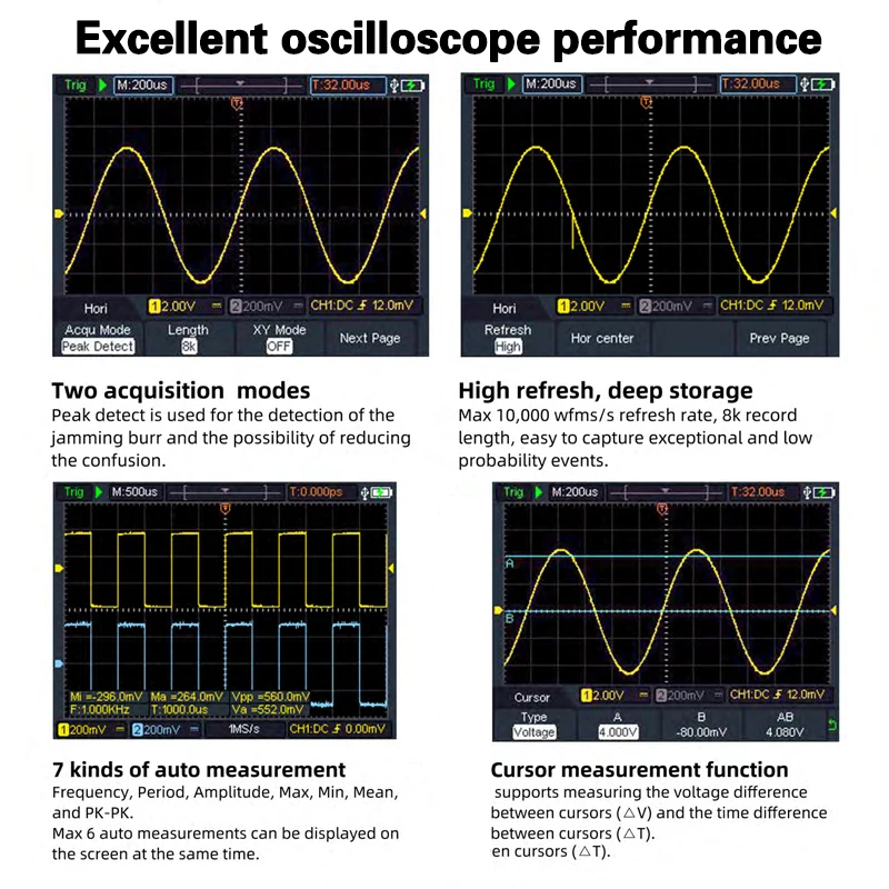 [2CH цифровой осциллограф] 2-канальный вход и полоса пропускания 40 МГц и 250MSa/s частота дискретизации в реальном времени и курсором благодаря функции измерения и XY Функция & множественной автоматической функции измерения и одним нажатием кнопки auto набор функций, легко обнаруживает и Отлаживает.