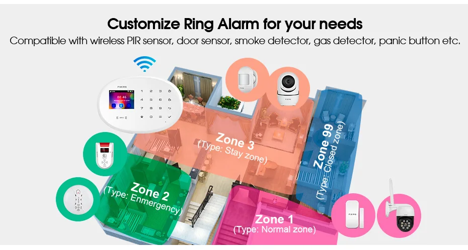Совместим с беспроводным PIR датчиком, датчиком двери, детектором дыма, детектором газа, кнопкой паники и т. д. Он широко используется для дома, фабрики, школы, магазина, виллы и жилого района, чтобы обеспечить защиту ценных активов