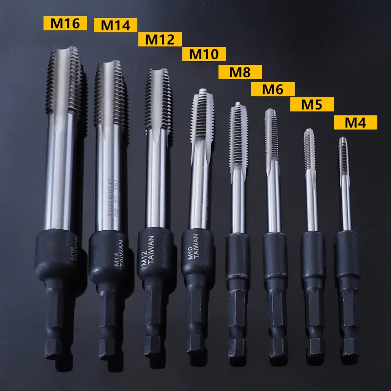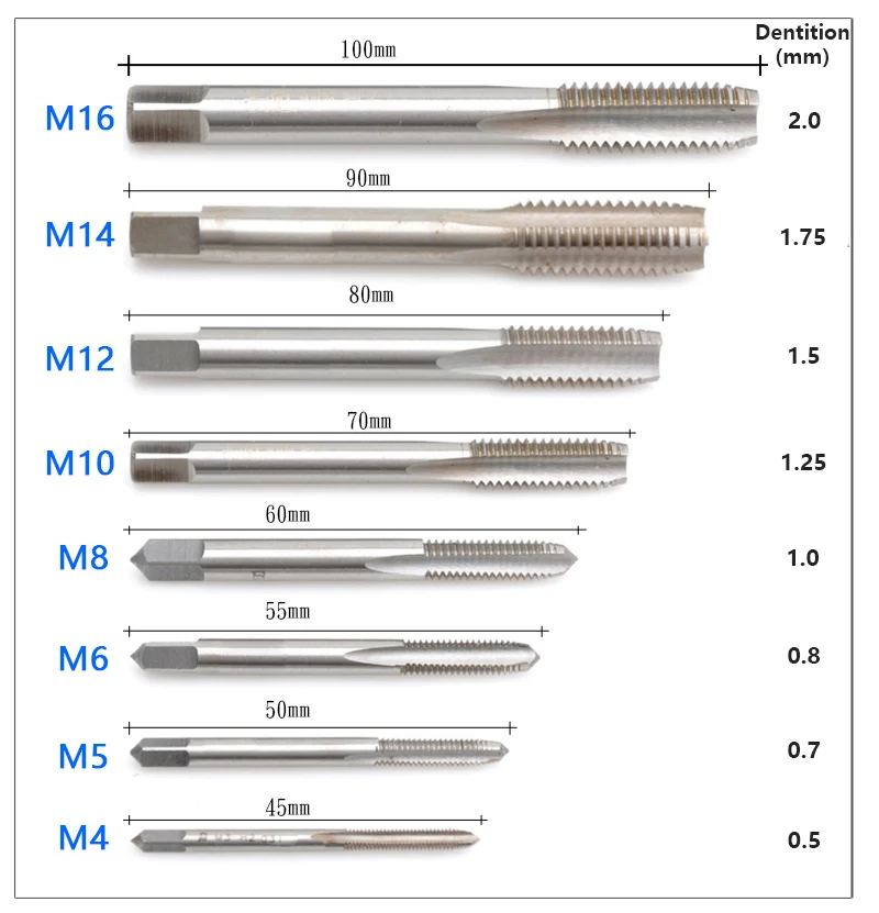 Всего 8 метчиков разных размеров от M4 до M16, которые можно использовать для нарезания различных нитей. M4-M8 головку без отверстия, M10-M16 плоская головка среднего отверстия.
