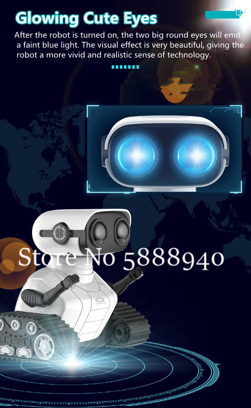 Большие глаза милые и светящиеся. После включения робота (tccicadas) два больших круглых глаза излучают слабый синий светильник. Визуальный эффект очень красивый, придающий роботу более яркое и реалистичное чувство технологии.