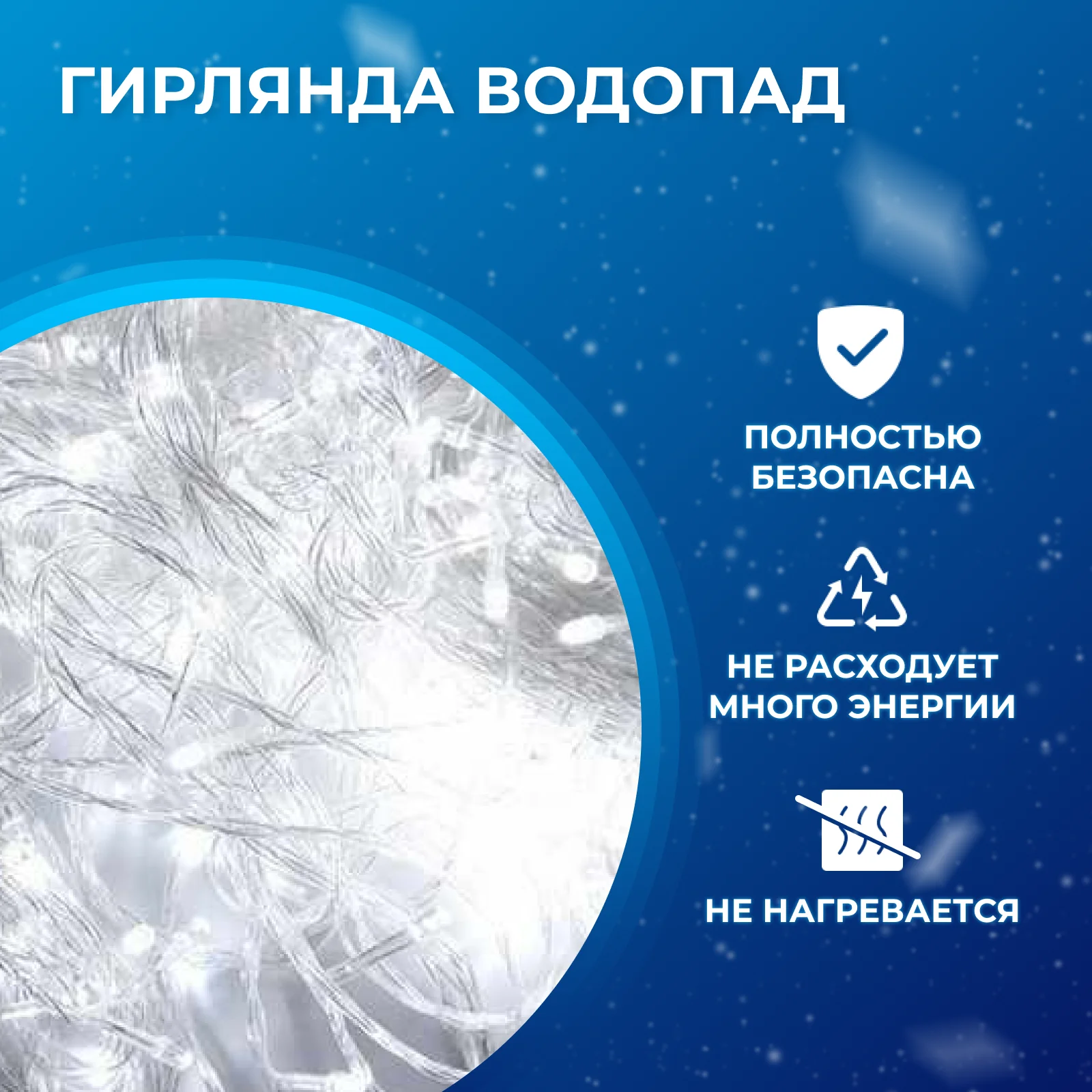 The waterfall LED electric garland, measuring 3x2 meters, with a transparent wire, burns with a cold white light. Christmas decoration will be the best option for decorating windows, walls, doorways, all kinds of New Year decorations. The waterfall garland is designed to decorate and illuminate residential and non-residential premises: apartments, country houses, offices, attics, gazebos, cafes, bars, restaurants, eateries, hairdressers, beauty salons and other public places where it is necessary to create an atmosphere of magic, celebration, comfort or a relaxing, calm atmosphere.