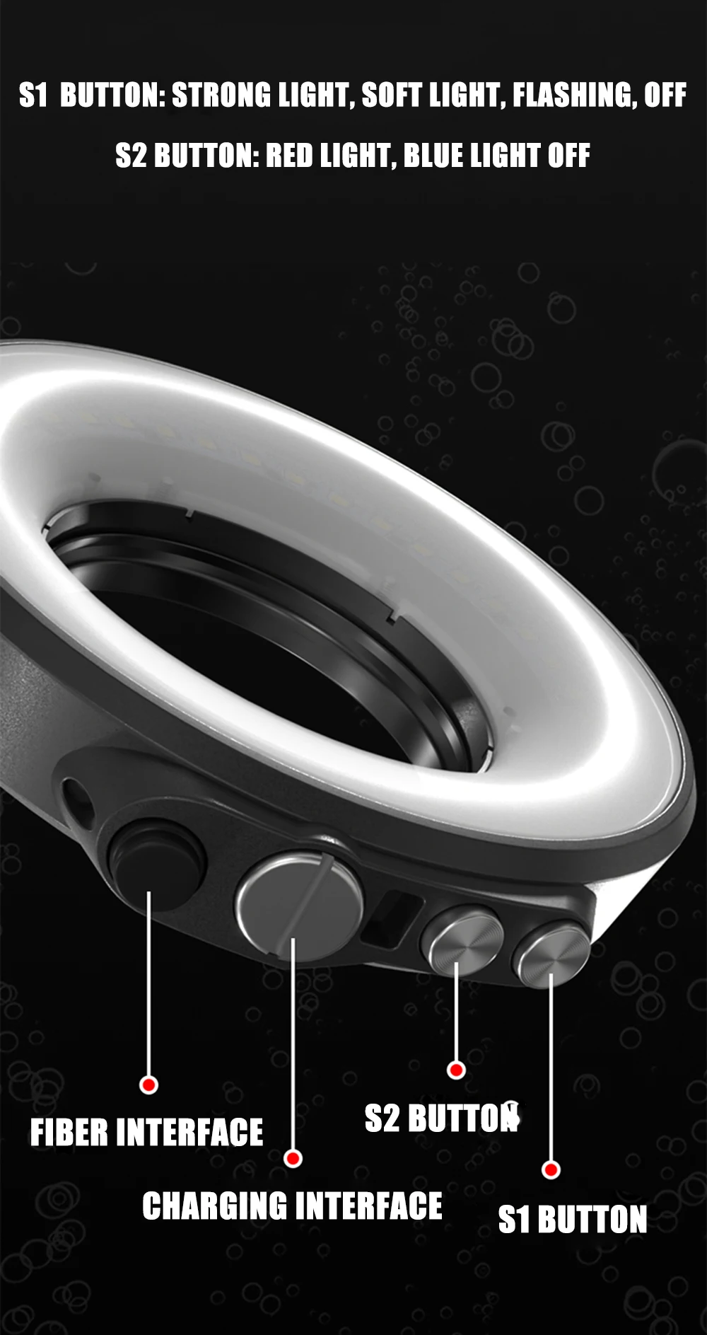 Нажмите кнопку S1 для цикла, кольцевой светильник включится в сильный светильник-низкий светильник-вспышка (четыре уровня).