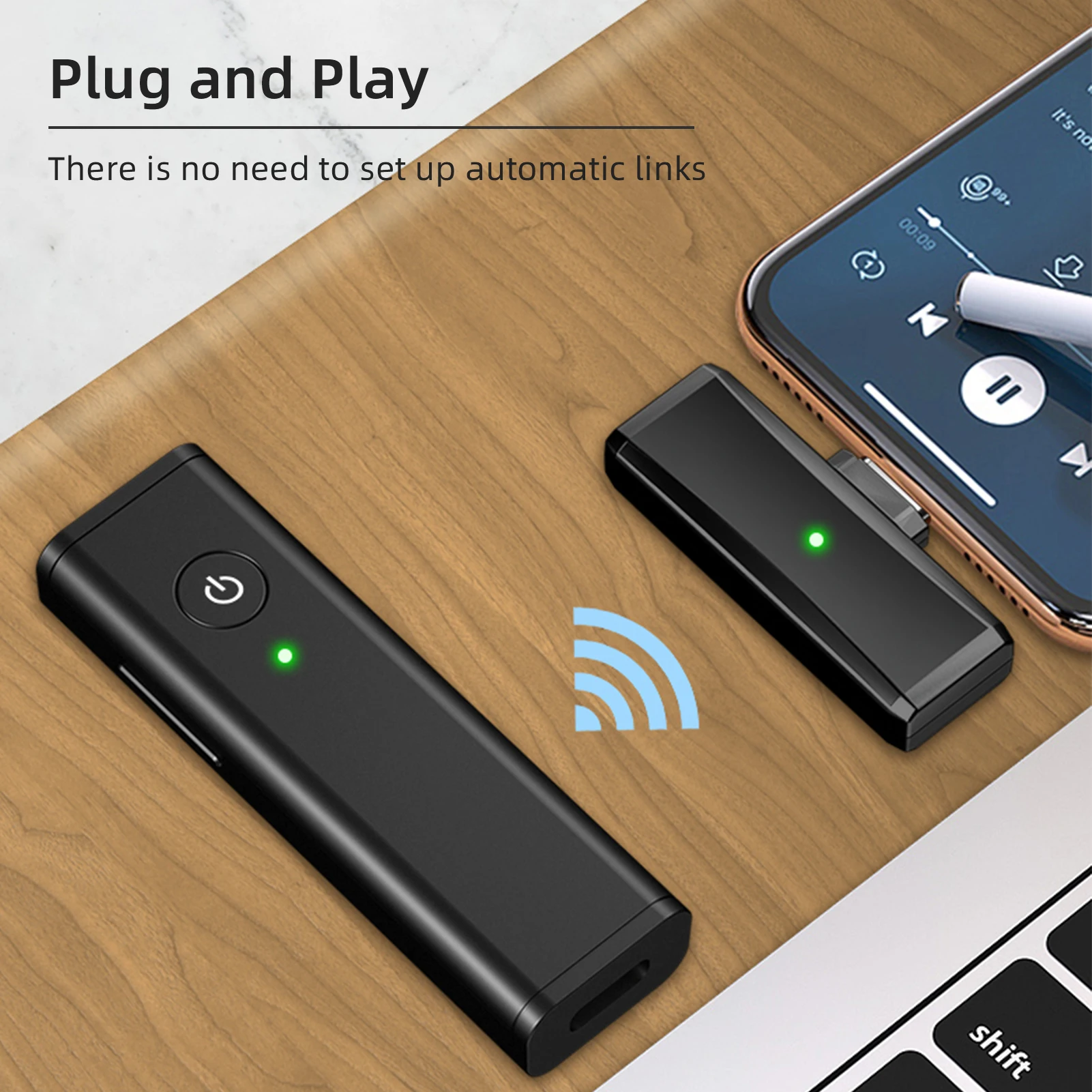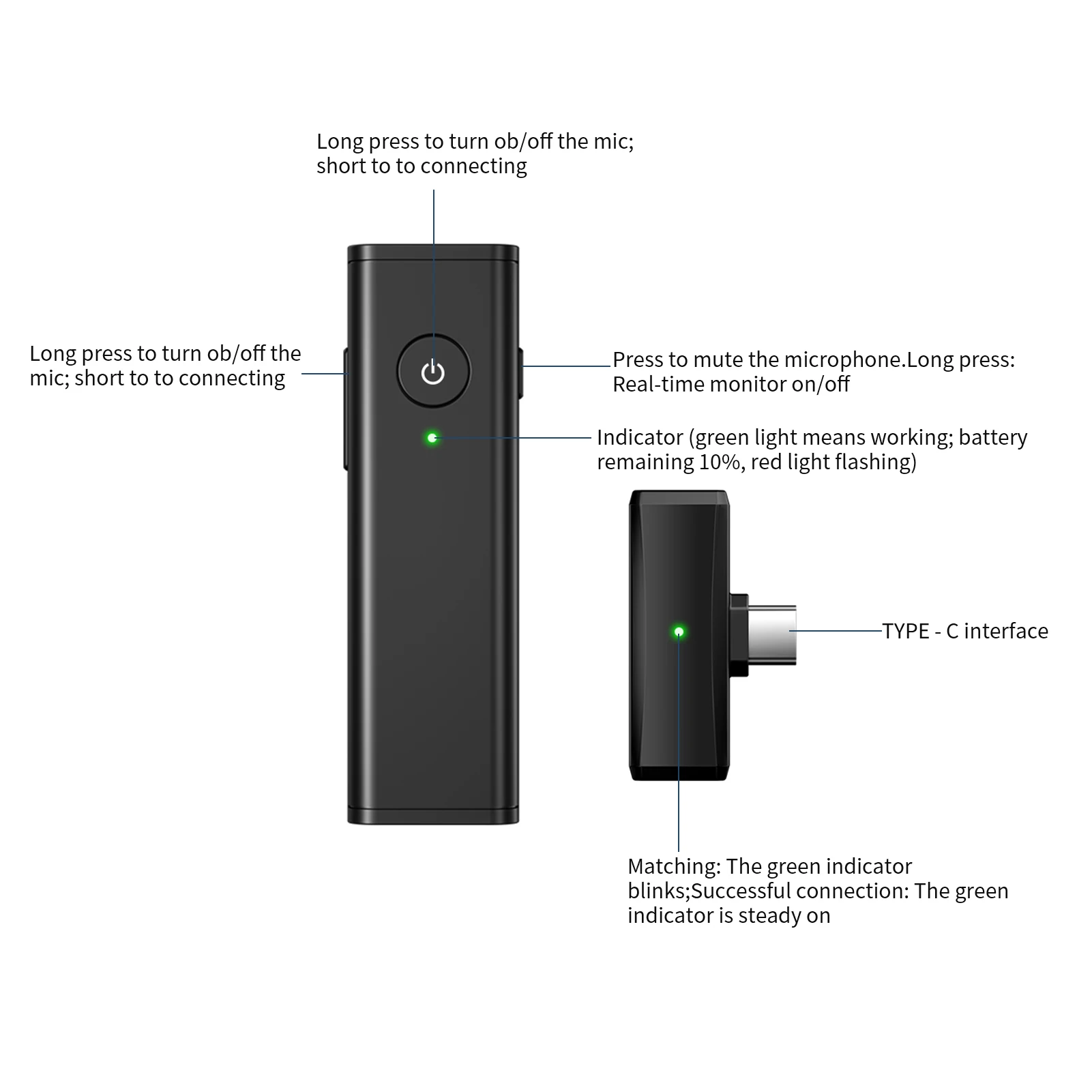 Приемник с интерфейсом Type-C, подключи и работай, прост в использовании. Передатчик собран в 160 мАч литиевая батарея, когда устройство полностью заряжено, она составляет около 6-6,5 часов рабочего времени.