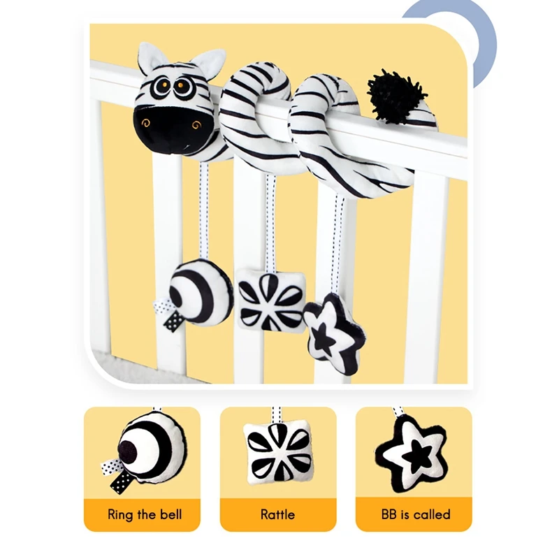 Милый дизайн животных для привлечения ребенка. Яркие и множественные цвета, которые стимулируют цветовое познание ребенка. Помогает стимулировать чувство ребенка через зрение, контакт и звук. Развивайте тактильные ощущения ребенка и естественную координацию рук и глаз. Легко обертывается вокруг коляски или стороны кроватки.
