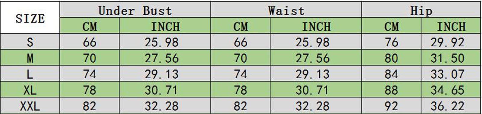 Пожалуйста, сравните детальные размеры с вашими перед покупкой! Цвета могут немного отличаться в зависимости от настроек компьютера и монитора Возможны незначительные отклонения в размере на 1-3 см разницу в размерах ввиду того, что Замеры производились вручную, спасибо (все размеры указаны в см, обратите внимание: 1 см = 0,39 дюйма) Размеры Американский размер Размер Великобритании Европейский размер Под грудью Талия Бедра S 2-4 6-8 32-34 66 см/25,98'' 66 см/25,98'' 76 см/29,92'' М 4-6 8-10 34-36 70 см/27,56'' 70 см/27,56'' 80 см/31,50'' L 6-8 10-12 36-38 74 см/29,13'' 74 см/29,13'' 84 см/33,07'' XL 8-10 12-14 38-40 78 см/30,71'' 78 см/30,71'' 88 см/34,65'' XXL 10-12 14-16 40-42 82 см/32,28'' 82 см/32,28'' 92 см/36,22''