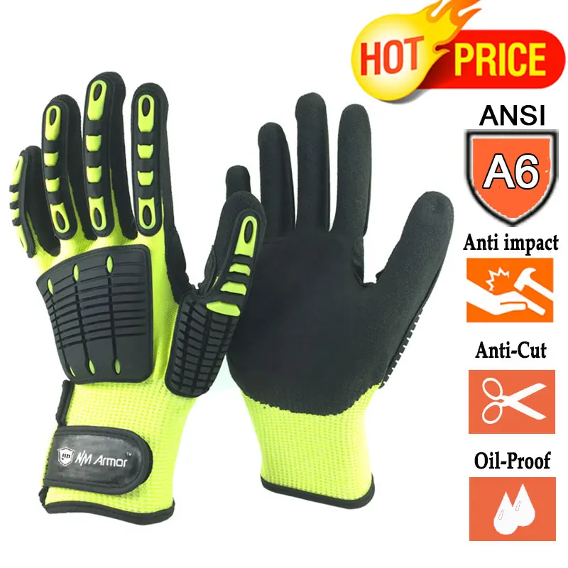 Полный палец и тремор-низкие перчатки, анти-вибрационные поглощающиеАнти-ударные механики перчатки, флуоресцентный нейлон + HPPE + Glassfirbe бесшовные трикотажные резостойкие лайнер с песочного нитрилового каучука с покрытием ладони рабочие перчатки.