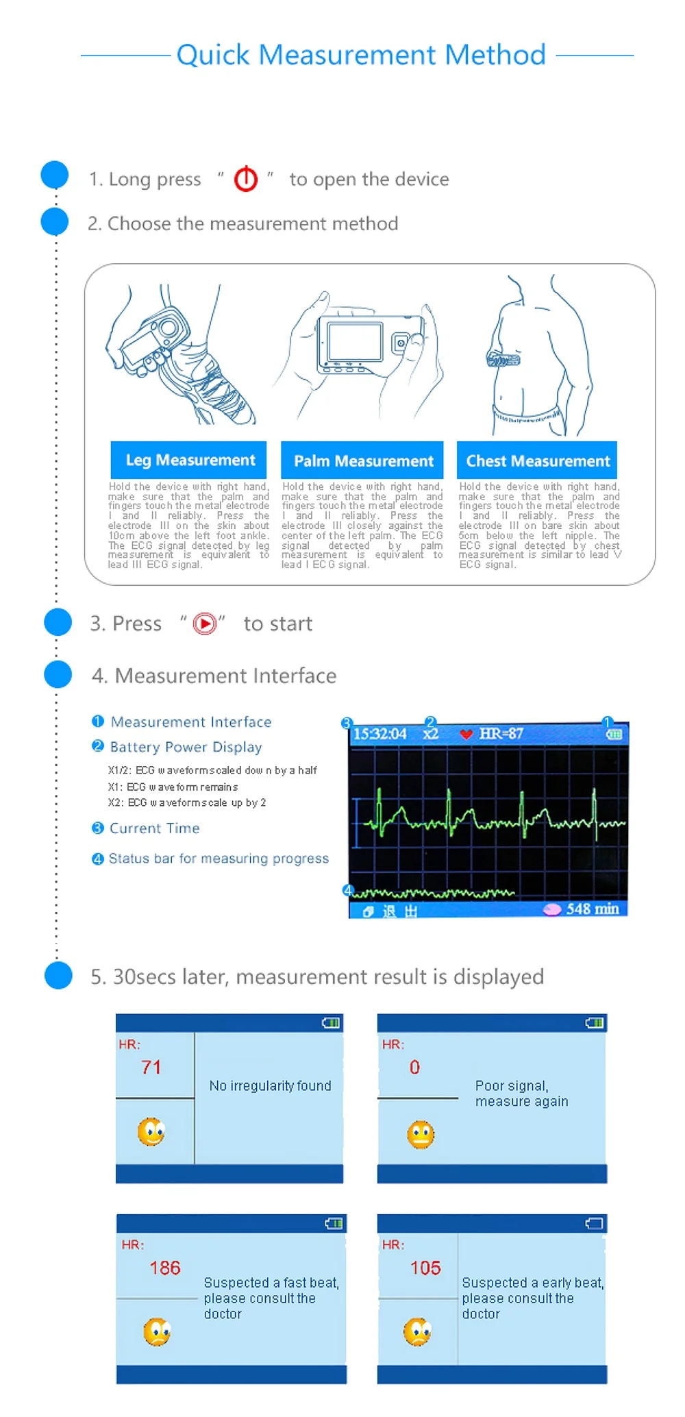 Heal Force ECG Monitor is intended for measuring and recording the ECG signal and determining average heart rate. Advanced measuring technology provides steady and accurate ECG waveform in about 30 seconds. Its user-friendly design allows patients to use by themselves at home.