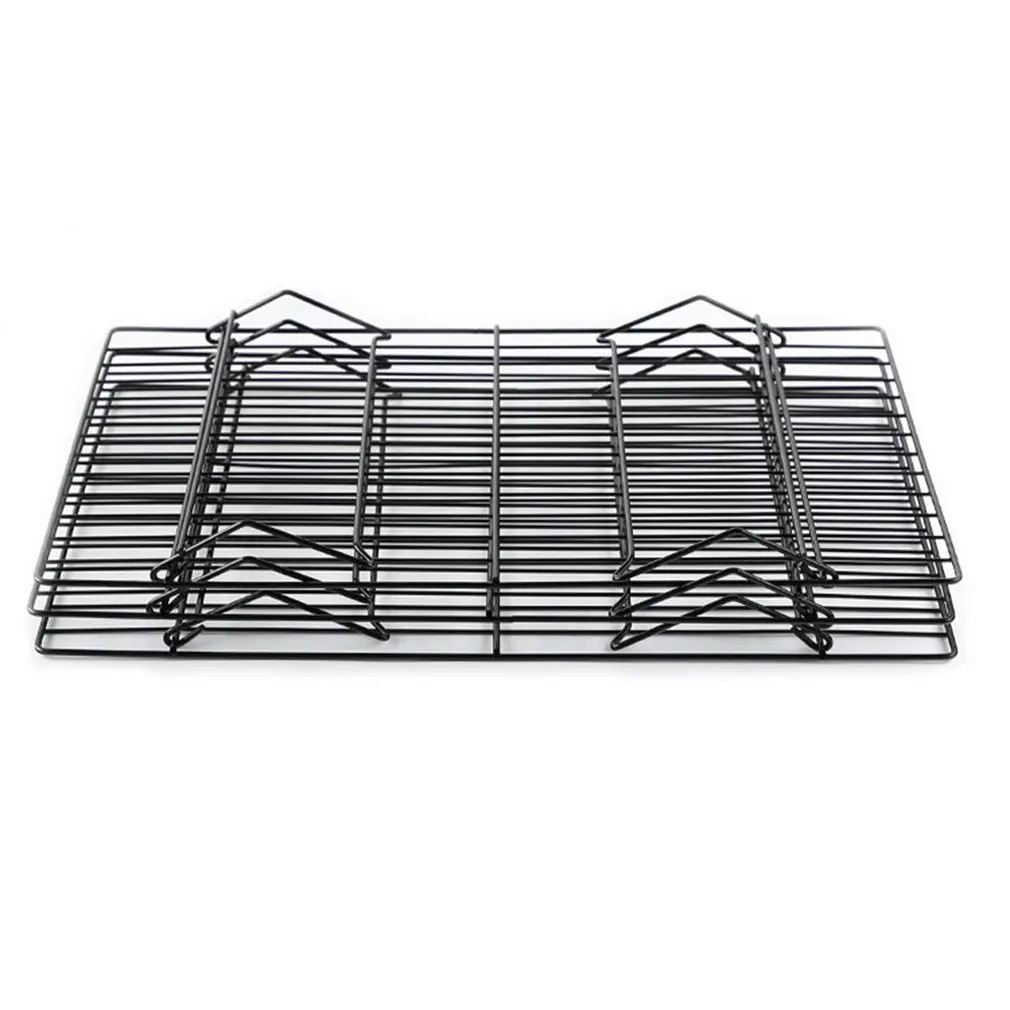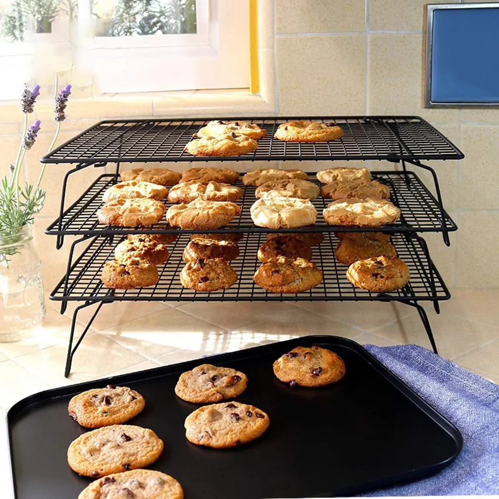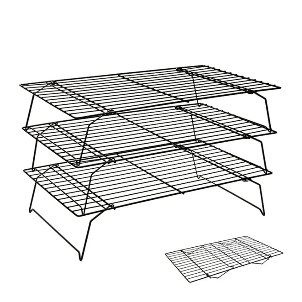 Features: 1. Stackable shelf: This shelf allows you to cool dozens of biscuits or other foods at the same time without taking up too much space. 2. Easy to install: This shelf can be easily installed in the bread cabinet without any tools, or you can directly lay it on the table. 3. Non-stick coating: This cooling rack uses non-stick coating for easy food release and quick cleaning. 4. Easy to clean: This cooling rack can be cleaned in a dishwasher. But for best results, please wash with warm soapy water before and after each use. 5. Good quality material: This shelf uses high-carbon steel and food-grade non-stick coating, which is sturdy and durable, and food can be safely placed on it. Description: This set includes 3 cooling grids, each measuring 40*25*22cm, all of which are foldable for easy storage. Specifications: Color: Black Size: 40*25*22cm Material quality: high carbon steel + food grade non-stick coating Use: baking and cooling Packing: color box Package Included: 1 pc * 3-tier cooling rack