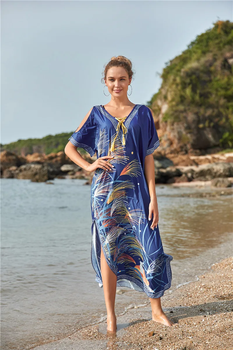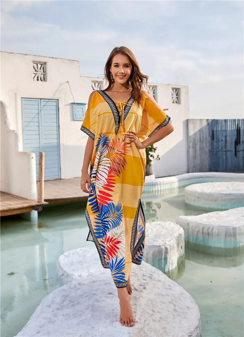 Новинка 2022, женское бикини, накидка, пуловер, цветочный принт, Пляжное Платье, длинный халат, Пляжное Платье, туника с v-образным вырезом, свободная пляжная одежда