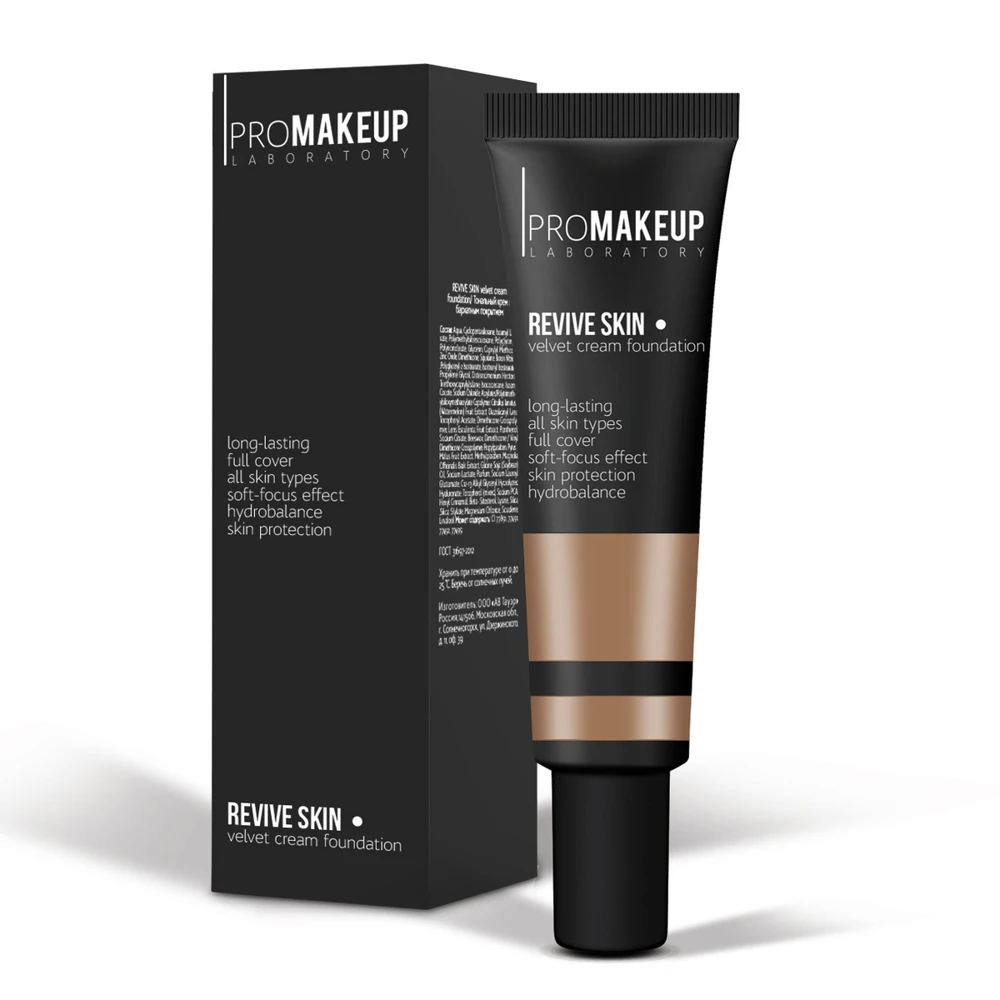 Стойкий тональный крем с бархатным финишем. Со степенью покрытия от среднего до плотного. Идеально наслаивается для максимальной степени маскировки несовершенств. Обладает софт-фокус эффектом, что позволяет избежать эффекта маски на лице. Защищает кожу и поддерживает необходимый уровень гидратации кожи в течение дня, сокращает мимические морщины. Содержит липофильную форму низкомолекулярной гиалуроновой кислоты, которая глубоко проникает в кожу и способствует восстановлению барьерной функции кожи. Обладает максимальной стойкостью даже на жирной коже. Уникальность REVIVE SKIN заключается в том, что он адаптируется под любой тип кожи. Активно впитывает себум при его появлении и увлажняет сухие участки на лице. При регулярном применении восстанавливает обезвоженную кожу. Тональный крем не подчеркивает шелушение на коже, мягко и деликатно скрывает признаки возраста, в том числе сглаживая рельеф на участках с активной мимикой. Для всех типов кожи, включая чувствительную. Подходит для ежедневного применения и профессионального использования, в том числе на съемках HD и 4К. Продукт представлен в шести оттенках: 201 слоновая кость / холодный 202 розово-бежевый / холодный 203 натуральный бежевый / нейтральный 204 песочно-бежевый / теплый 205 песочный / теплый 206 ореховый / нейтральный