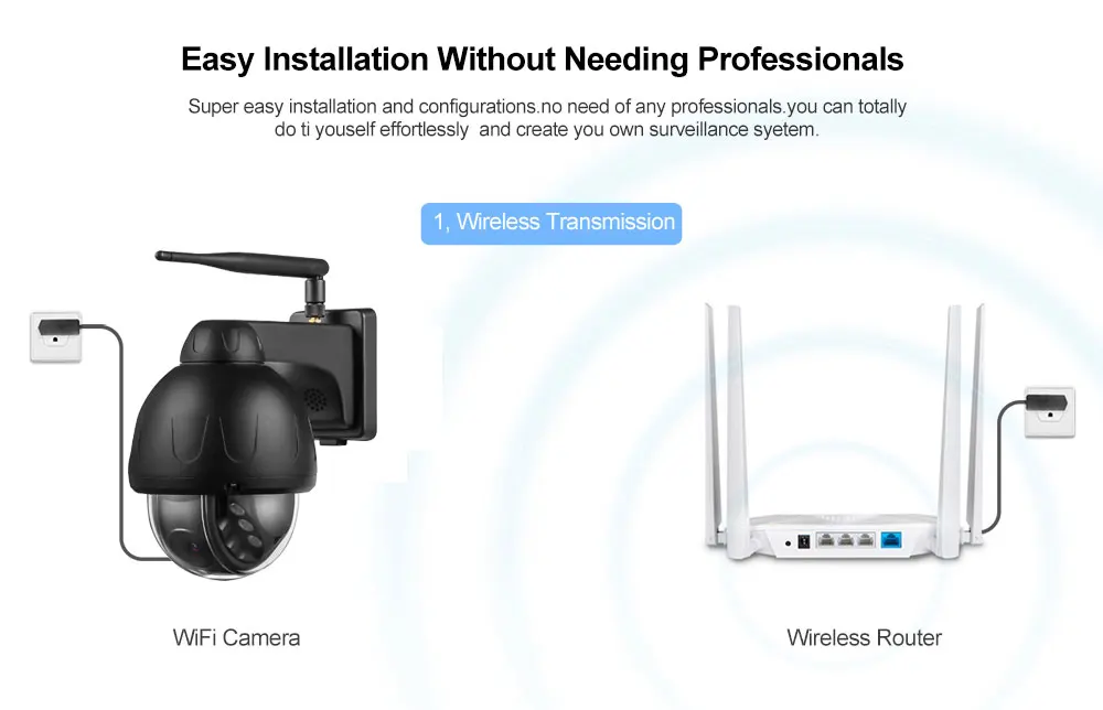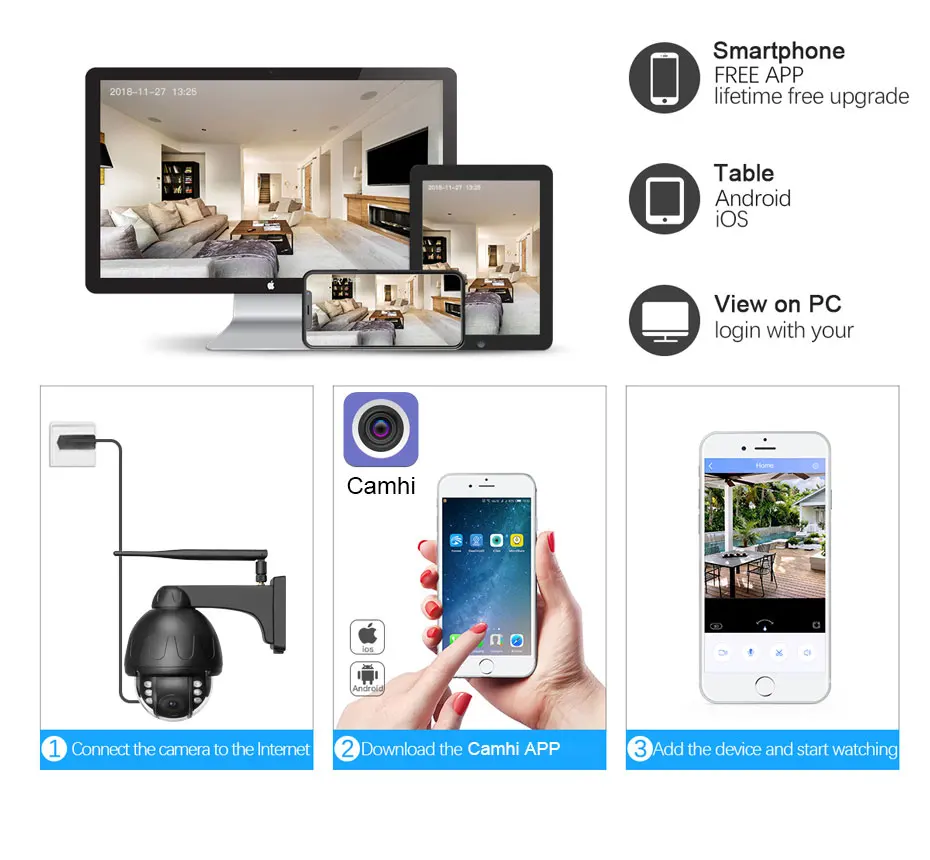 Поддерживает 2,4 ГГц Wi-Fi и подключения к локальной сети, независимо от того, где вы находитесь, вы можете удаленно получить доступ к камере, чтобы увидеть прямые трансляции и оставайтесь на связи. Удаленно просматривайте камеру с помощью приложения на мобильных устройствах IOS и Android.