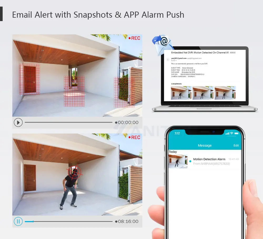Никакие человеческие движения не проскальзывают без вашего уведомления. Получайте мгновенные уведомления от приложений, оповещения по электронной почте и запись движения, когда обнаруживаются события движения.