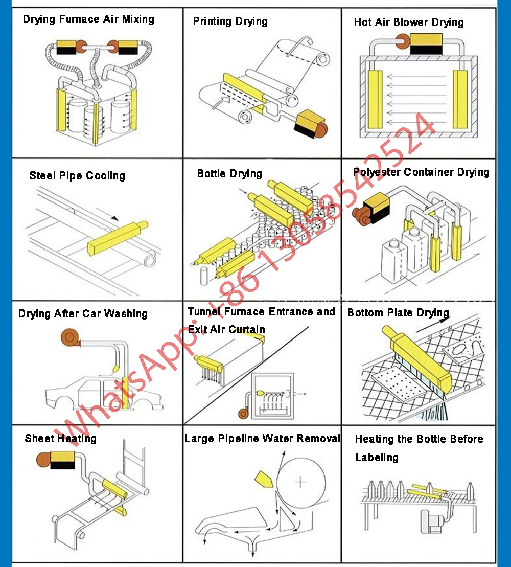 (1). Автомобильная промышленность: используется для выдувания дополнительной воды, охлаждающей жидкости, пыли, мусора и т. д. в производстве, а также для выдувания охлаждения, сушки и удаления пыли перед покраской стальной пластины. (2). Электронная промышленность: электронные печатные платы быстро высушиваются перед сборкой. (3). Консервирование напитков и изготовление бутылок: перед нанесением этикеток, нанесением чернил или упаковкой бутылки для напитков, выдувкой воды и насадок бутылки во рту или бутылке. (4). Химическая промышленность: выдуйте поверхностные химические вещества или влагу перед маркировкой или упаковкой. (5). Продукты питания и медицина: перед производством или упаковкой выдуйте влагу и насадки или удалите пыль из отверстия и мешка перед упаковкой. (6). Металлическая промышленность: выдуйте охлаждающую жидкость или другие жидкости с металлической поверхности. Поверхность высушивается или охлаждается перед полировкой, гальваническим покрытием и покраской. (7). Резиновая и пластиковая промышленность: выдуйте пыль или мусор на поверхности продукта. Высушите перед экструзией или впрыском. Продукт охлаждается после литья под давлением. (8). Печать (струйная): струйная печать, выдувание пыли, мусора и водяного пара перед печатью или использование чернил для быстрого высыхания.