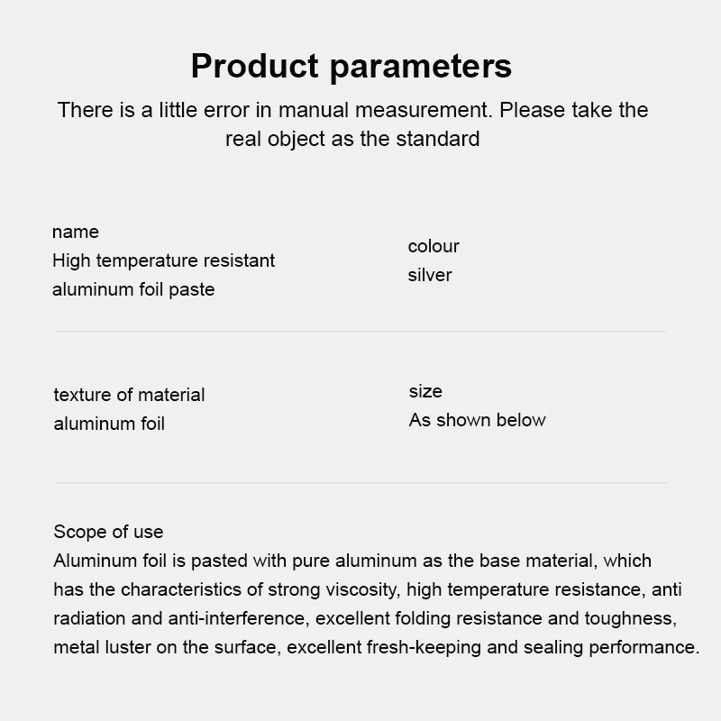 Aluminum foil is pasted with pure aluminum as the base material, which has the characteristics of strong viscosity, high temperature resistance, anti radiation and anti-interference, excellent folding resistance and toughness, and excellent surface metallic luster, fresh-keeping and sealing performance.