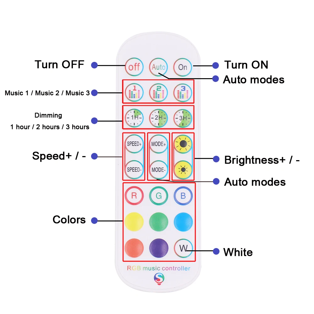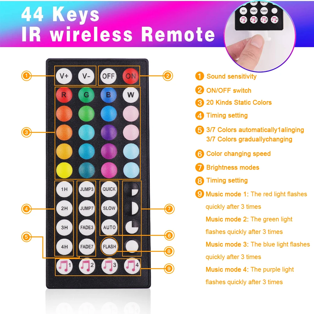Tuya Smart wifi с инфракрасным ПДУ с 24 кнопками музыкальный контроллер представляет собой новый Wi-Fi беспроводной интеллигентая (ый) Пульт дистанционного управления светодиойдный Шарообразная контроллер. Может регулировать временной промежуток режим освещения с помощью смартфона APP или измените статический цвет и динамический режим света лента с инфракрасным ПДУ с 24 кнопками пульт дистанционного управления, а также регулировать яркость света полосы. WIFI RGB контроллер широко используется в гостиницах, барах, btc, семейных и т. д. Этот продукт может быть интеллектуальным соединен с несколькими устройствами, и он может управляться Amazon Alexa, Google Assistant, Xiaodu и Tmall Elf intelligent voice. Контроллер имеет микрофон, и свет может меняться с ритмом музыки.