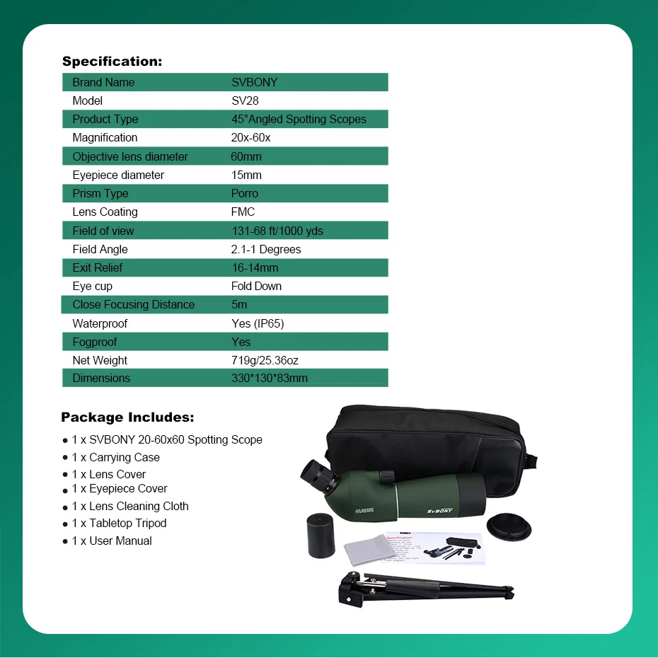 1. SVBONY 20-60x60mm Zoom Spotting Scope with standard tripod.