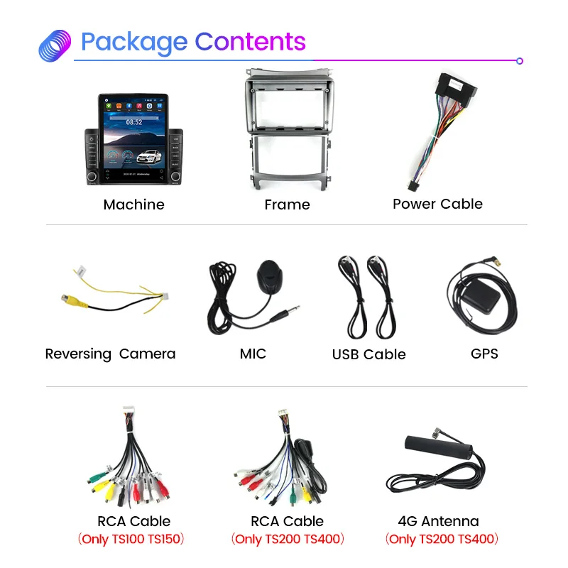> TS100: android 11 + IPS экран + Quad Core 1,3 ГГц + 1 г + 16 ГРОМ + Разноцветный свет + RDS + сплит-экран + BT 4,0 + WIFI + FM + 1080P воспроизведения видео + Поддержка рулевое колесо> TS150: android 11 + IPS экран + Quad Core 1,3 ГГц + 2 г + 32 ГРОМ + Разноцветный свет + RDS + сплит-экран + BT 4,0 + WIFI + FM + 1080P воспроизведения видео + Поддержка управление рулевым колесом + Builtin Carplay + Android auto> TS200: android 11 + IPS экран + восемь ядер 2,5 ГГц + 2 г + 32 ГРОМ + Разноцветный свет + RDS + сплит-экран + BT 5,0 + WIFI + FM/AM + 1080P воспроизведения видео + Поддержка управления рулем + 36EQ DSP + 4G LTE (со слотом для sim-карты) + Встроенный Carplay + Android auto + Поддержка 360 камеры (360 камеры необходимо заказать отдельно)> TS400: android 11 + IPS экран + восемь ядер 2,5 ГГц + 4 г + 64 гром + Разноцветный свет + RDS + сплит-экран + BT 5,0 + WIFI + FM/AM + 1080P воспроизведения видео + Поддержка управления рулем + 36EQ DSP + 4G LTE (со слотом для sim-карты) + Встроенный Carplay + Android auto + Поддержка 360 камеры (360 камеры необходимо заказать отдельно)> TS800: android 11 + IPS экран + восемь ядер 2,5 ГГц + 8 г + 128 гром + Разноцветный свет + RDS + сплит-экран + BT 5,0 + WIFI + FM/AM + 1080P воспроизведения видео + Поддержка управления рулем + 36EQ DSP + 4G LTE (со слотом для sim-карты) + Встроенный Carplay + Android auto + Поддержка 360 камеры (360 камеры необходимо заказать отдельно)Дополнительные аксессуары> Голосовое управление опционально> 360 камера (поддерживает только TS200 TS400 TS800)> Задняя камера, ADAS DVR камера, мониторинг давления в шинах, OBD2, DAB +