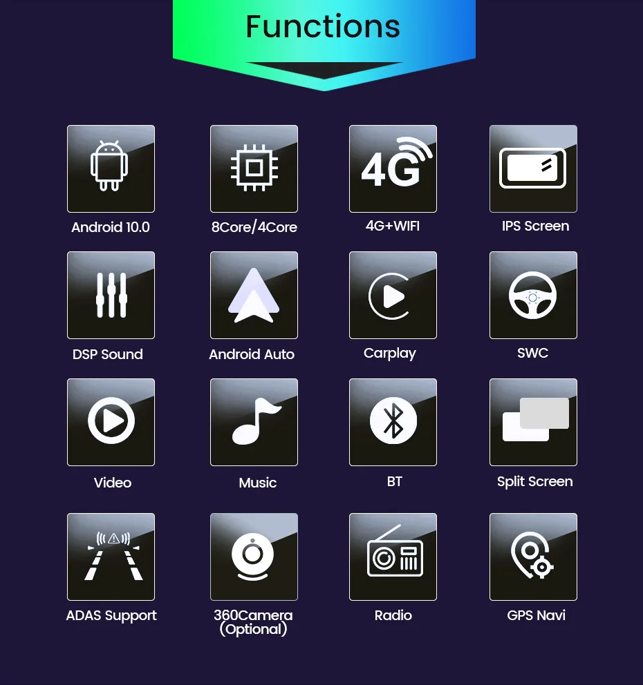 > TS100: система Android + IPS экран + Quad Core 1,3 ГГц + 1 г + 16 ГРОМ + Разноцветный свет + RDS + сплит-экран + BT 4,0 + WIFI + FM/AM + 1080P воспроизведения видео + Поддержка управления рулем > TS150: система Android + IPS экран + Quad Core 1,3 ГГц + 2 г + 32 ГРОМ + Разноцветный свет + RDS + сплит-экран + BT 4,0 + WIFI + FM/AM + 1080P воспроизведения видео + Поддержка управления рулем + 36EQ DSP > TS200: андроид 10 + IPS экран + восемь ядер 2,5 ГГц + 2 г + 32 ГРОМ + Разноцветный свет + RDS + сплит-экран + BT 5,0 + WIFI + FM/AM + 1080P воспроизведения видео + Поддержка управления рулем + 36EQ DSP + 4G LTE (со слотом для sim-карты) + Встроенный Carplay + Android auto + Поддержка 360 камеры (360 камеры необходимо заказать отдельно) > TS400: андроид 10 + IPS экран + восемь ядер 2,5 ГГц + 4 г + 64 гром + Разноцветный свет + RDS + сплит-экран + BT 5,0 + WIFI + FM/AM + 1080P воспроизведения видео + Поддержка управления рулем + 36EQ DSP + 4G LTE (со слотом для sim-карты) + Встроенный Carplay + Android auto + Поддержка 360 камеры (360 камеры необходимо заказать отдельно) Дополнительные аксессуары> Голосовое управление опционально> 360 камера (поддерживает только TS200 TS400)> Задняя камера, ADAS DVR камера, мониторинг давления в шинах, OBD2, DAB +