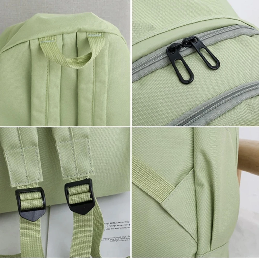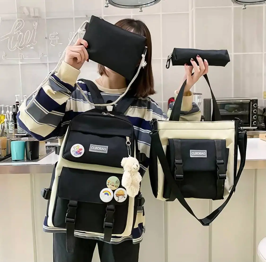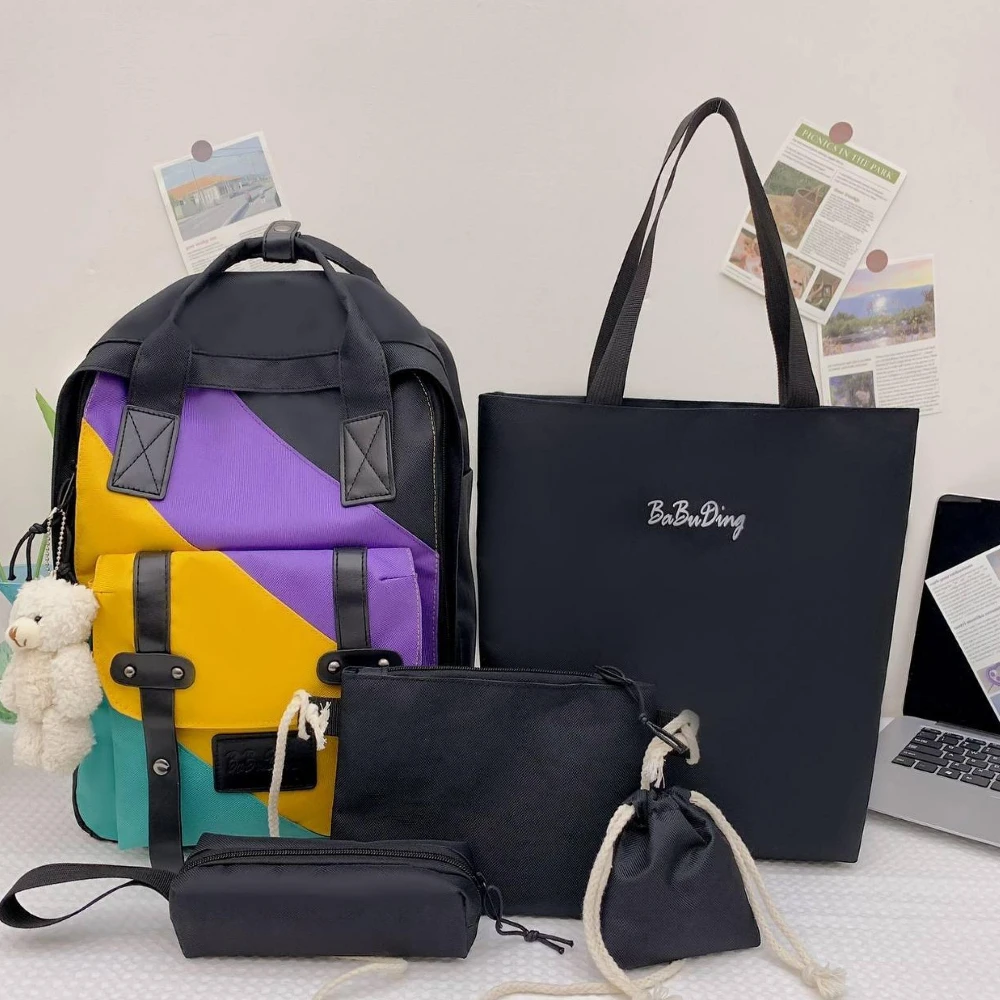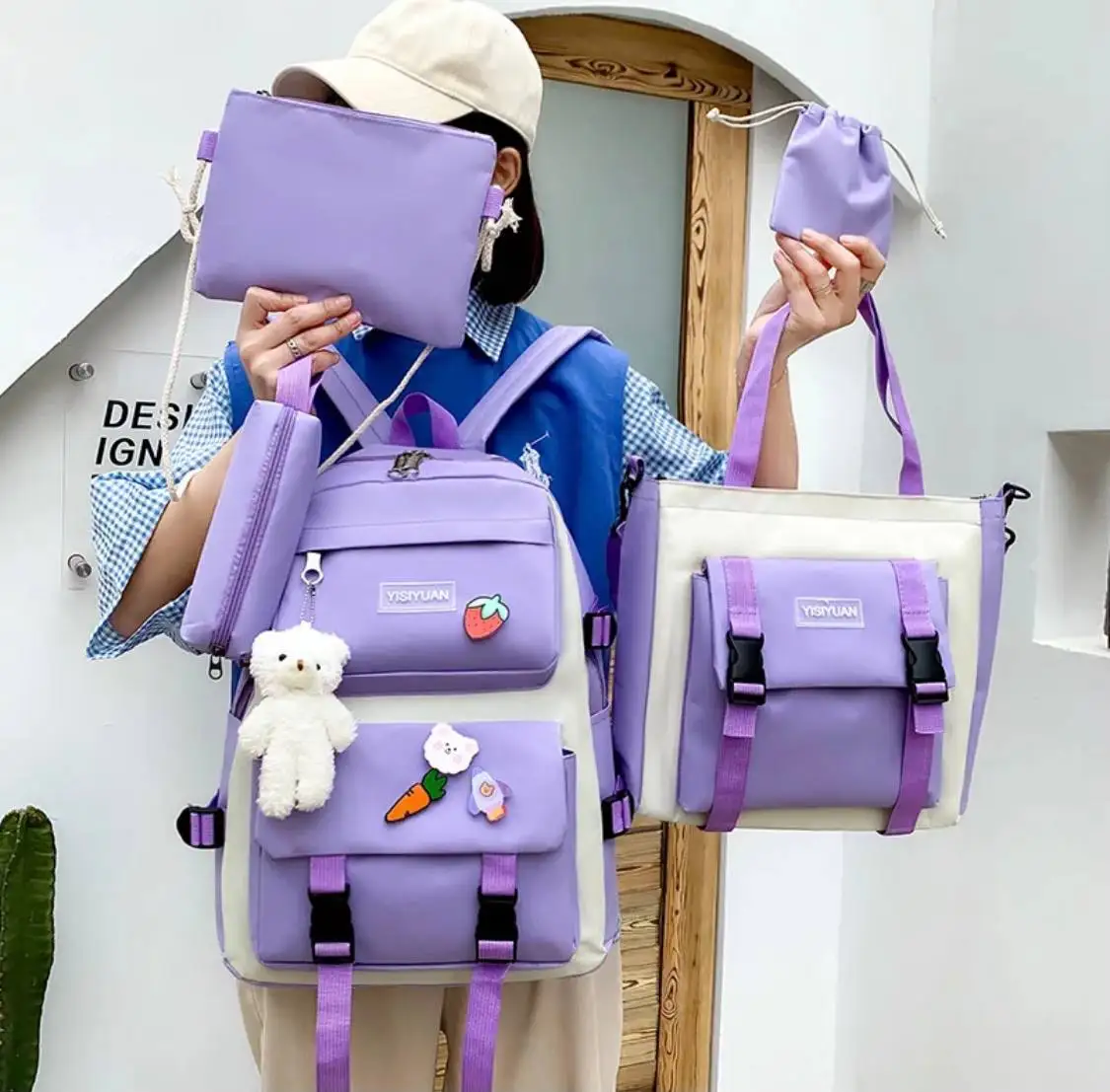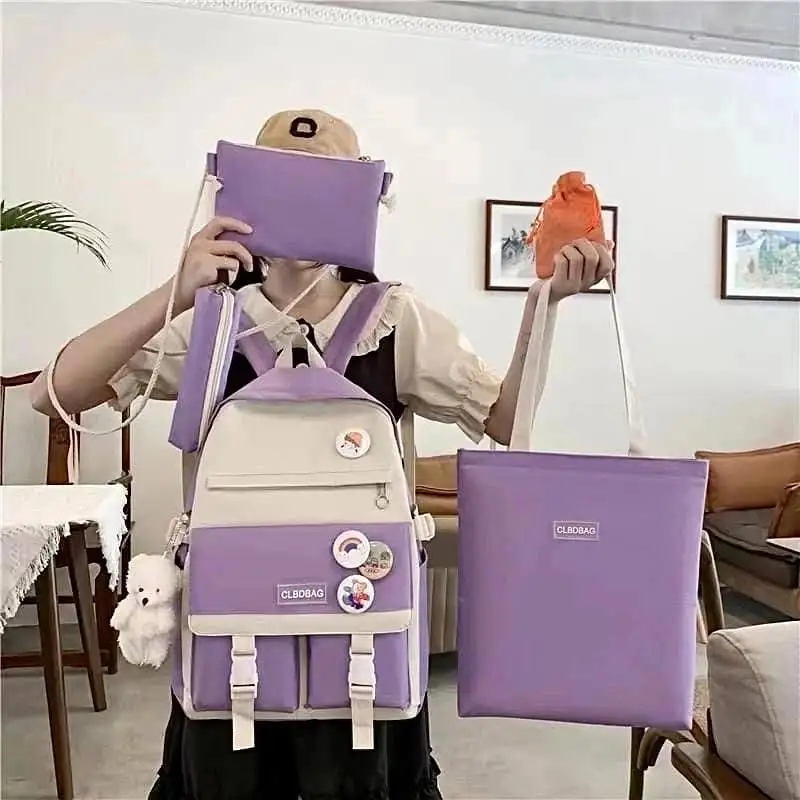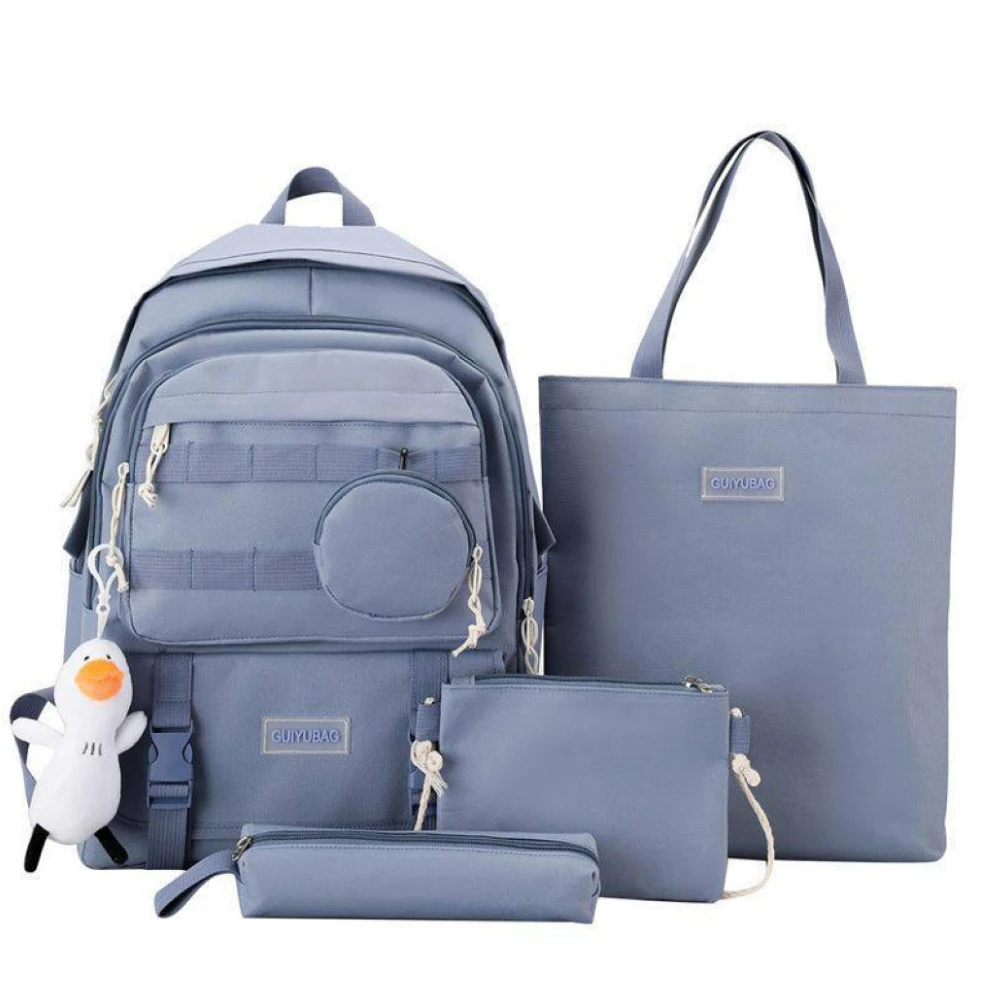 В комплект из 4 и 5 предметов входят рюкзак, клатч, чехол-карандаш, сумка, мешочек (в комплекте 5 предметов). Идеальный дорожный набор, для колледжа, школы и для повседневной жизни. Комплект изготовлен из высококачественной ткани. Легко моется. Есть отделение для ноутбука, папка А4, для телефона, для мелочей, для офиса. Есть боковой скрытый карман для планшета. Очень вместительный рюкзак. Ультралегкий, является отличной альтернативой громоздким школьным портфелям.