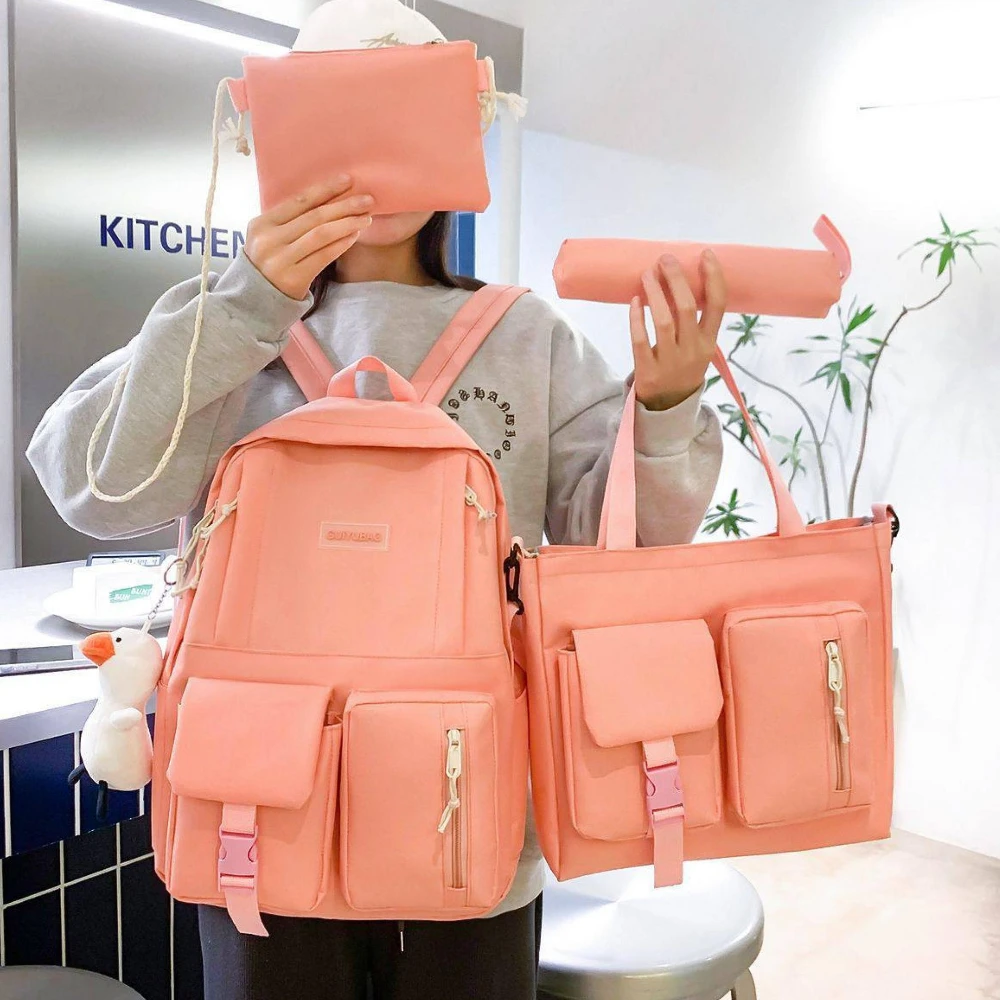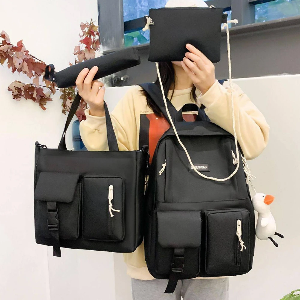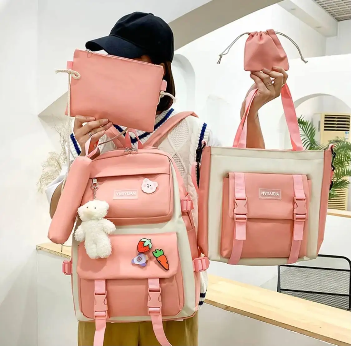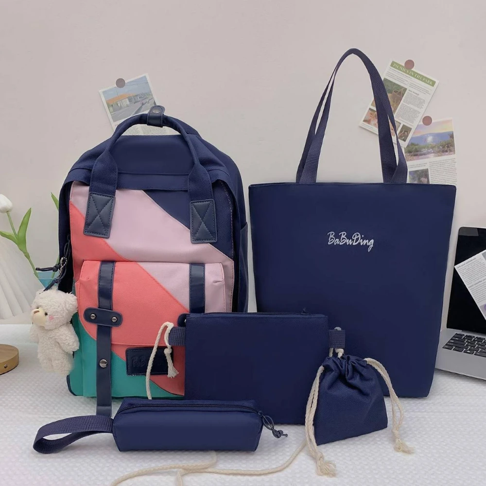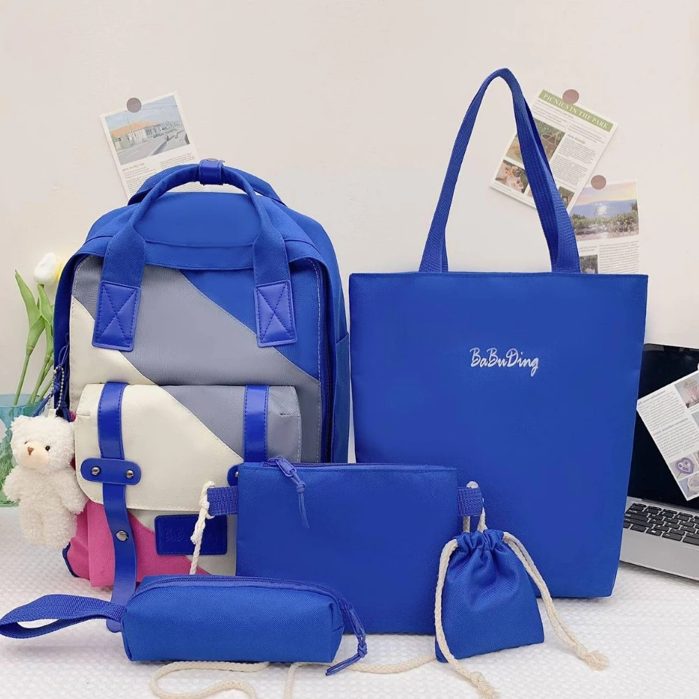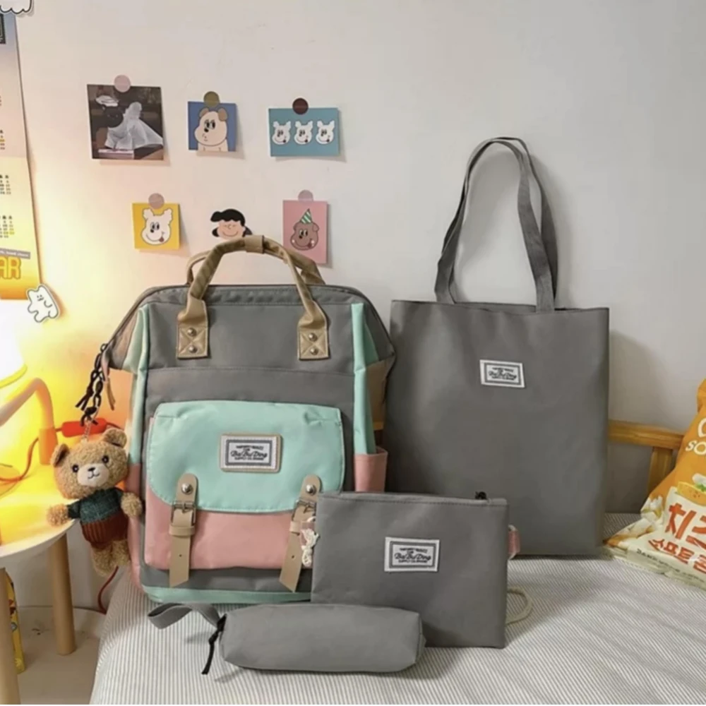 В комплект из 4 и 5 предметов входят рюкзак, клатч, чехол-карандаш, сумка, мешочек (в комплекте 5 предметов). Идеальный дорожный набор, для колледжа, школы и для повседневной жизни. Комплект изготовлен из высококачественной ткани. Легко моется. Есть отделение для ноутбука, папка А4, для телефона, для мелочей, для офиса. Есть боковой скрытый карман для планшета. Очень вместительный рюкзак. Ультралегкий, является отличной альтернативой громоздким школьным портфелям.