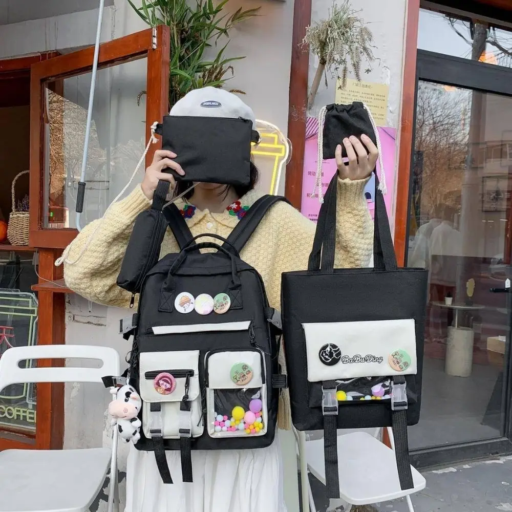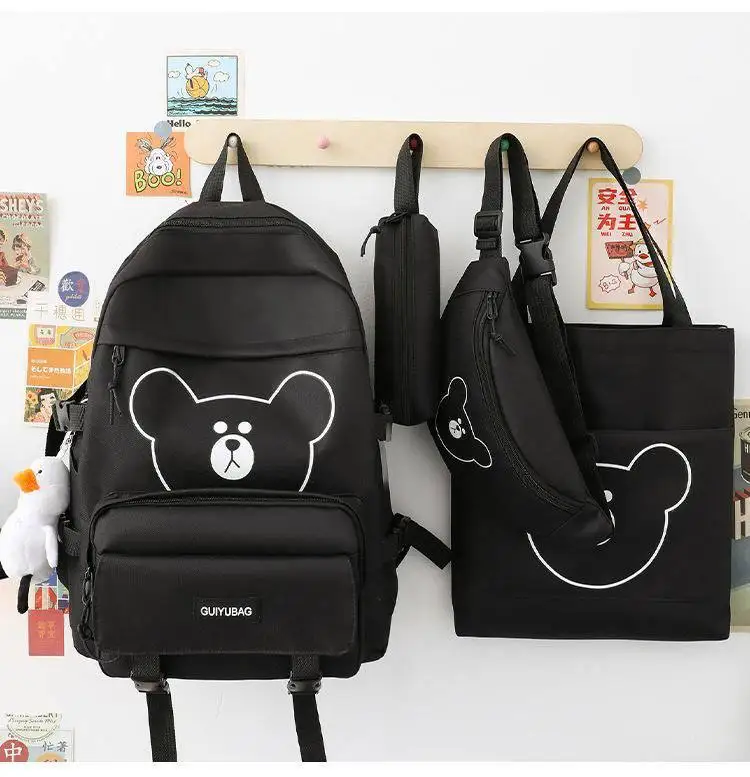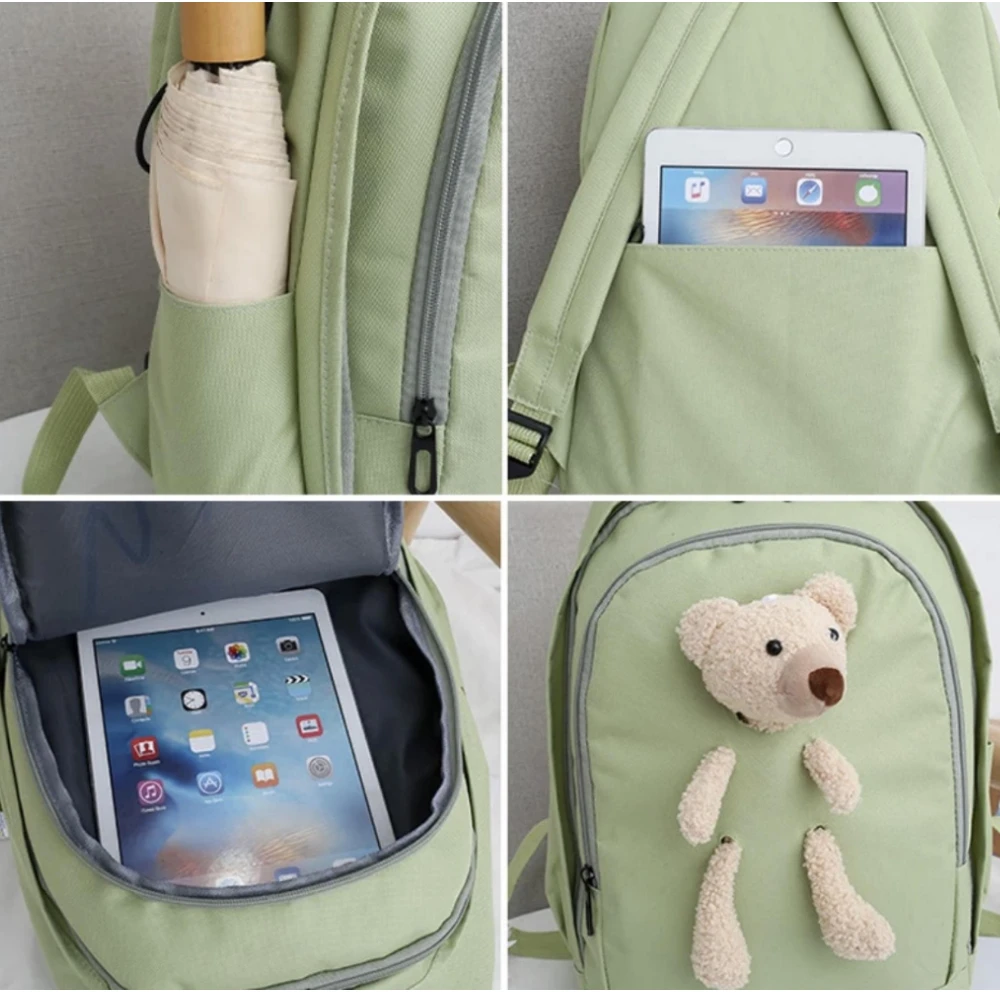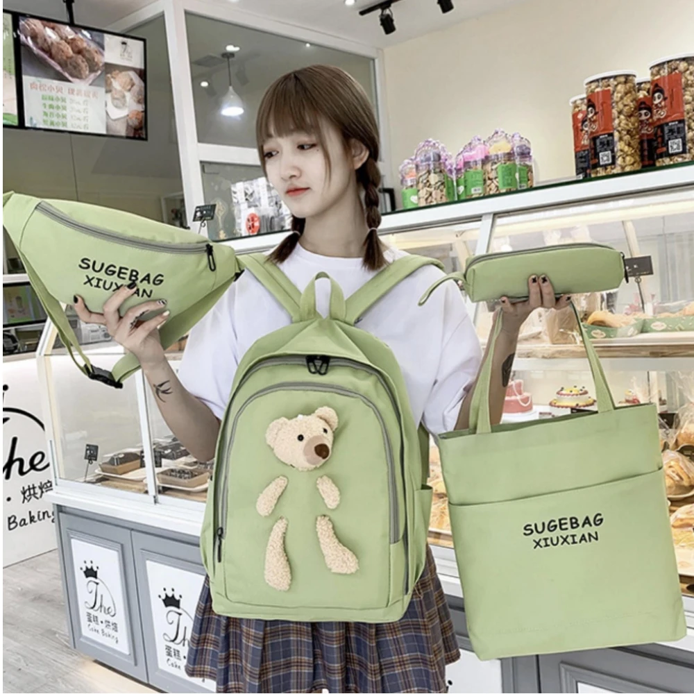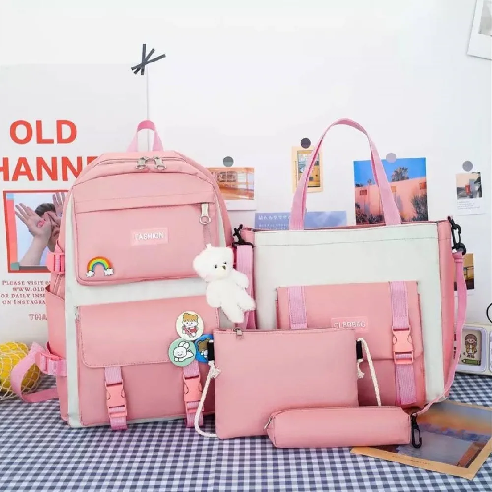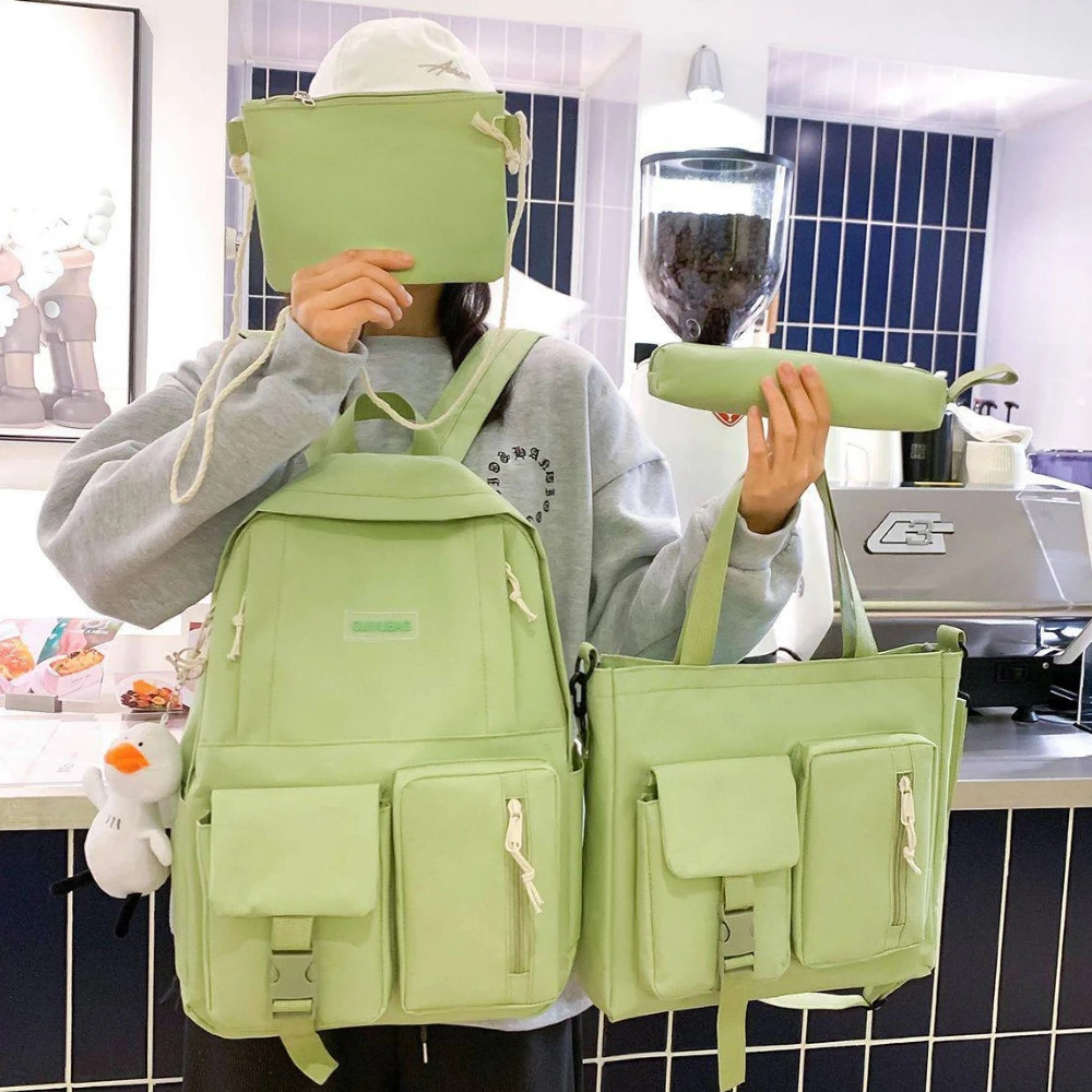 В комплект из 4 и 5 предметов входят рюкзак, клатч, чехол-карандаш, сумка, мешочек (в комплекте 5 предметов). Идеальный дорожный набор, для колледжа, школы и для повседневной жизни. Комплект изготовлен из высококачественной ткани. Легко моется. Есть отделение для ноутбука, папка А4, для телефона, для мелочей, для офиса. Есть боковой скрытый карман для планшета. Очень вместительный рюкзак. Ультралегкий, является отличной альтернативой громоздким школьным портфелям.