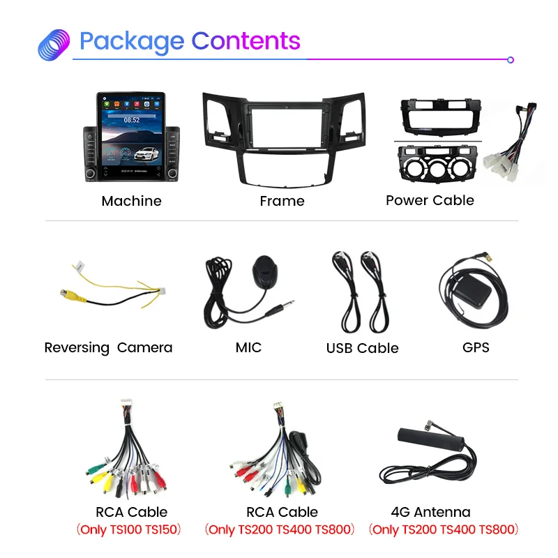 > TS100: android 11 + IPS экран + Quad Core 1,3 ГГц + 1 г + 16 ГРОМ + Разноцветный свет + RDS + сплит-экран + BT 4,0 + WIFI + FM + 1080P воспроизведения видео + Поддержка рулевое колесо > TS150: android 11 + IPS экран + Quad Core 1,3 ГГц + 2 г + 32 ГРОМ + Разноцветный свет + RDS + сплит-экран + BT 4,0 + WIFI + FM + 1080P воспроизведения видео + Поддержка управление рулевым колесом + Builtin Carplay + Android auto > TS200: android 11 + IPS экран + восемь ядер 2,5 ГГц + 2 г + 32 ГРОМ + Разноцветный свет + RDS + сплит-экран + BT 5,0 + WIFI + FM/AM + 1080P воспроизведения видео + Поддержка управления рулем + 36EQ DSP + 4G LTE (со слотом для sim-карты) + Встроенный Carplay + Android auto + Поддержка 360 камеры (360 камеры необходимо заказать отдельно) > TS400: android 11 + IPS экран + восемь ядер 2,5 ГГц + 4 г + 64 гром + Разноцветный свет + RDS + сплит-экран + BT 5,0 + WIFI + FM/AM + 1080P воспроизведения видео + Поддержка управления рулем + 36EQ DSP + 4G LTE (со слотом для sim-карты) + Встроенный Carplay + Android auto + Поддержка 360 камеры (360 камеры необходимо заказать отдельно)> TS800: android 11 + IPS экран + восемь ядер 2,5 ГГц + 8 г + 128 гром + Разноцветный свет + RDS + сплит-экран + BT 5,0 + WIFI + FM/AM + 1080P воспроизведения видео + Поддержка управления рулем + 36EQ DSP + 4G LTE (со слотом для sim-карты) + Встроенный Carplay + Android auto + Поддержка 360 камеры (360 камеры необходимо заказать отдельно) Дополнительные аксессуары> Голосовое управление опционально> 360 камера (поддерживает только TS200 TS400 TS800)> Задняя камера, ADAS DVR камера, мониторинг давления в шинах, OBD2, DAB +