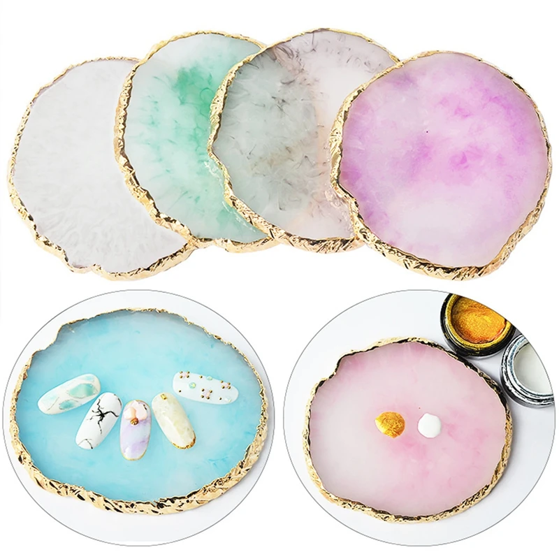 Описание: Изготовлен из полимерного материала, имитирует натуральные Агатовые драгоценные камни, с золотым краем покрытия, круглой формы и элегантного яркого цвета, выглядит ярким, как настоящий Агат, но более износостойким и сломанным. Каждая часть этой неправильной свободной формы, почти круглая или овальная, ручной работы, что делает ее уникальной и необычайно. Используется для палитры цветного смешивания ногтей и других цветовых смесительных пластин, таких как Парикмахерская, художественная живопись, косметический макияж и т. д. Также отлично подходит для показа ювелирных изделий, художественных ремесел и домашнего украшения, подвесного орнамента, украшения стола, подставки для напитков, подстаканник и т. д.