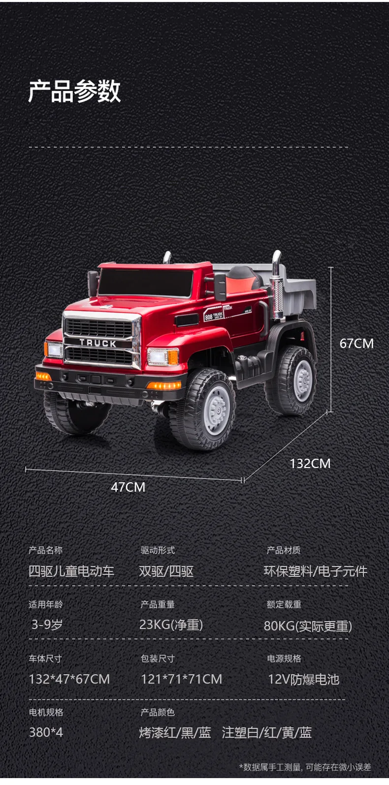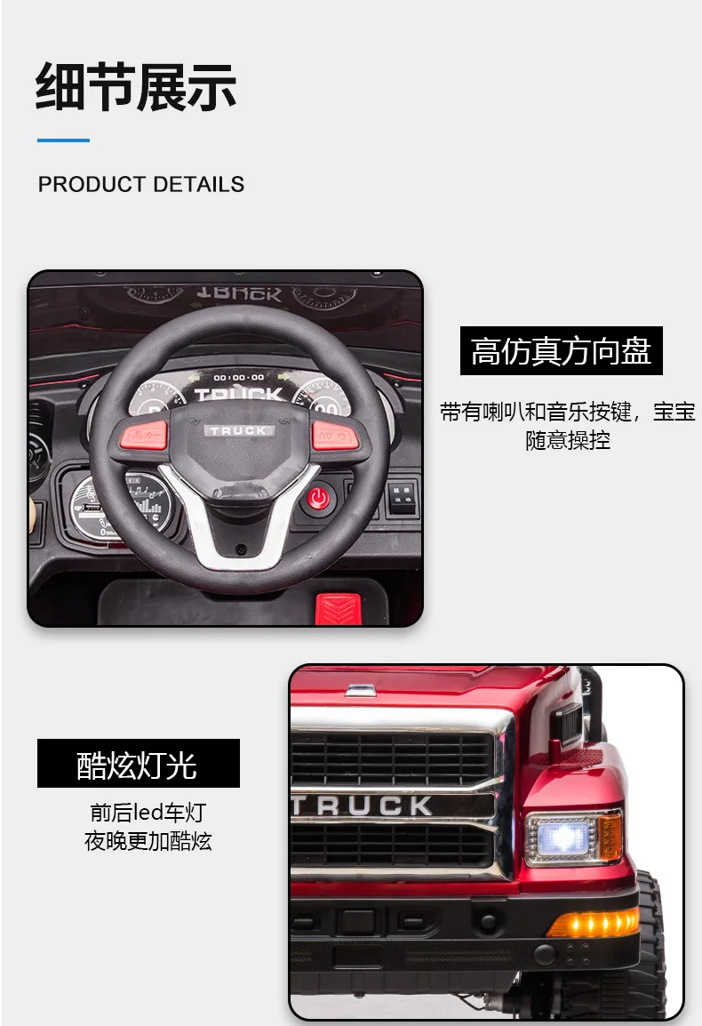 [Battery specification: 12V7A] + [four-wheel drive with shock absorption] + [multi-function remote control (can control speed regulation, slow start and slow stop, acceleration and deceleration, music switching, swing movement, music lighting, power supply, whistle, brake system and other functions)]+[one-button start]+[battery display]+[electric dump handle control, with safety lock]+[simulation headlights]+[early education function]+[English story]+[LED headlights] ]+[USB socket]+[MP3 socket]+[Swing]+[Double door]