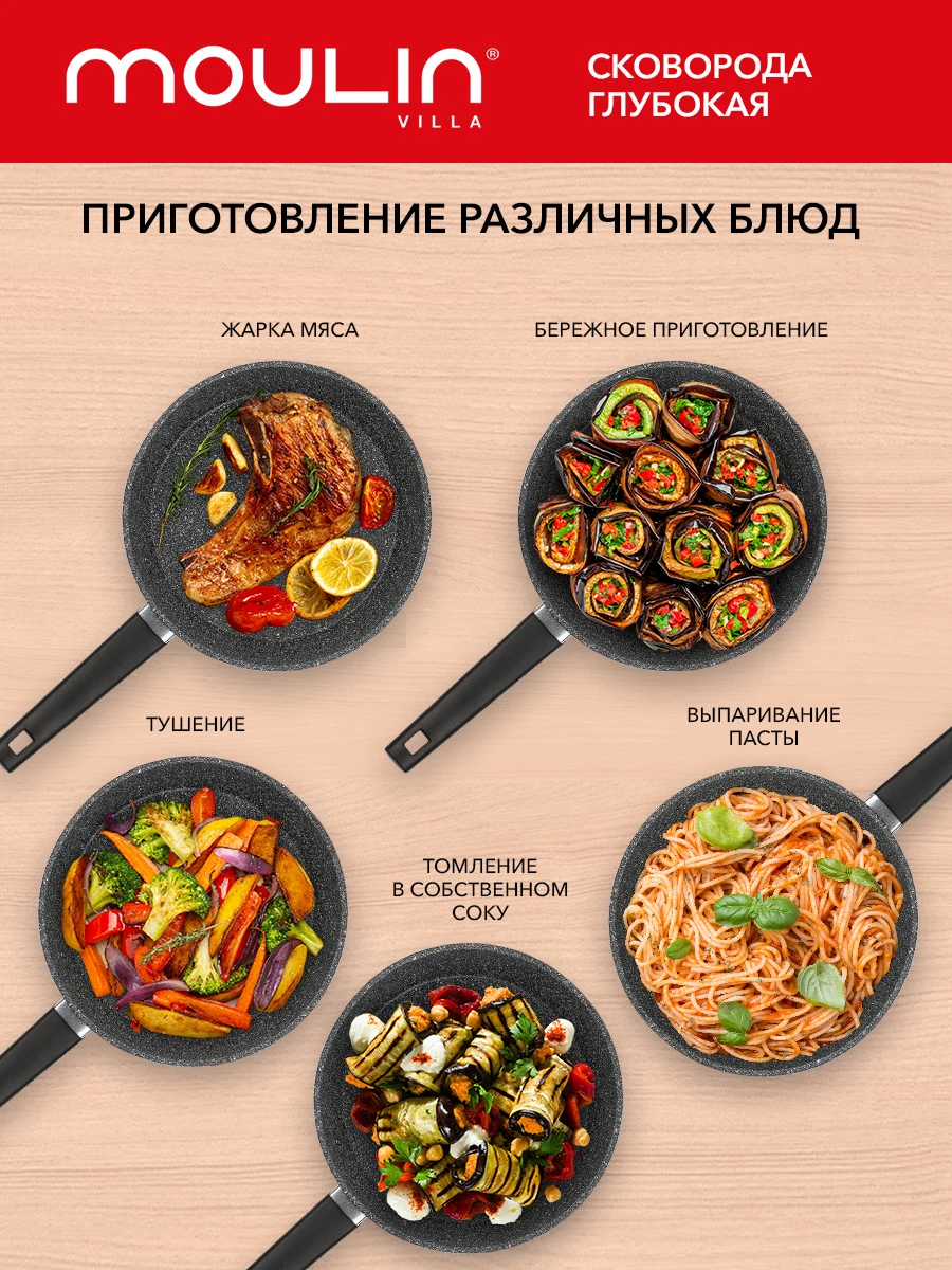 В глубоких сковородах антипригарных Impression IMP-24-DI, IMP-26-DI, IMP-28-DI можно и тушить, и жарить, в них удобно перемешивать, не опасаясь перепачкать стол и плиту. Прожарка получается идеальной за счёт правильного распределения тепла и оптимальной толщины дна и стенок. Высокие бортики делают удобным процесс приготовления пищи и открывают новые возможности.