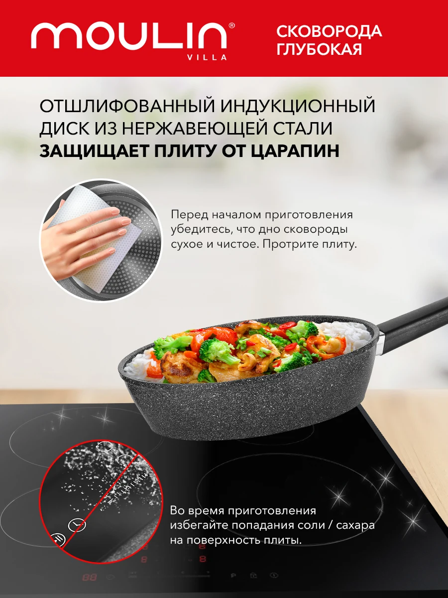 Прочное стальное дно придаёт сковороде дополнительную жёсткость и устойчивость, позволяет использовать посуду на всех типах плит, в том числе индукционных.