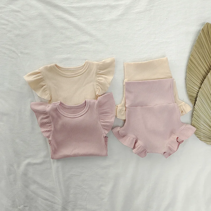Комплект одежды из 2 предметов для маленьких девочек летний хлопковый комбинезон с оборками и рукавами-крылышками для малышей, комплект с шортами с высокой талией, одежда для маленьких девочек conjuntos