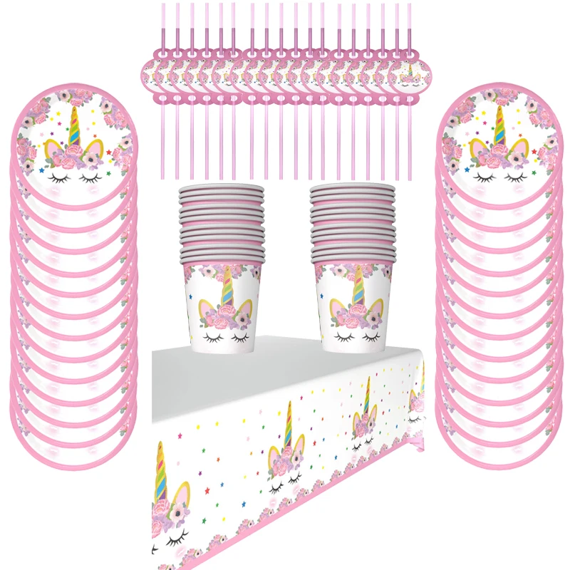Unicorn Birthday Disposable Tableware Set Paper Cup Plate Drinking Straw Tablecloth Boy Girl Kids Birthday Party Decorations