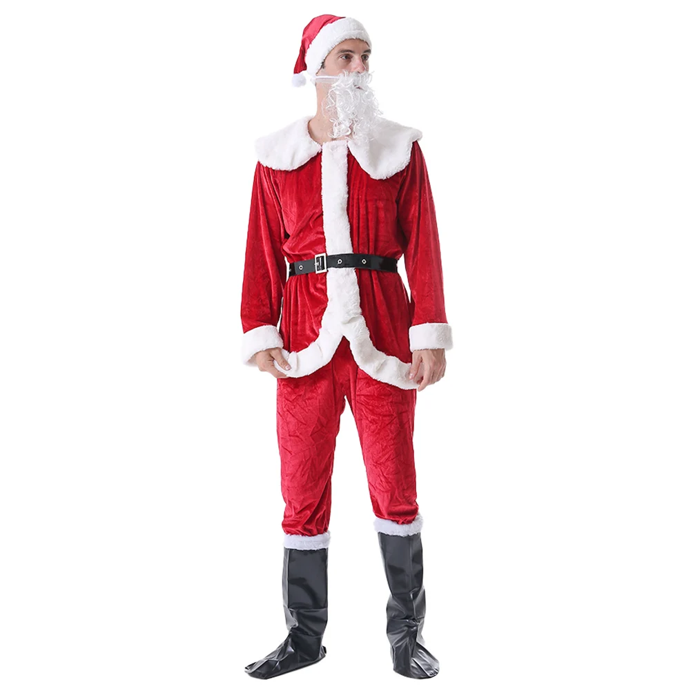 Костюм Санта-Клауса из 6 предметов; Рождественский костюм для костюмированной вечеринки; Праздничная одежда; Пальто и брюки; Шляпа; Обувь с ремнем с бородой; Наряды для взрослых; Рождественский подарок