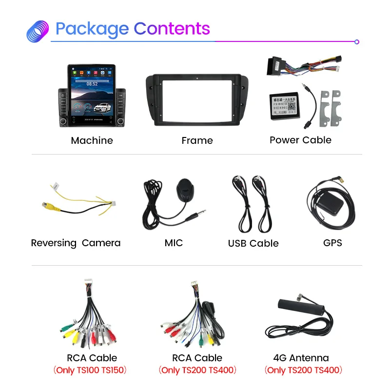 > TS100: android 11 + IPS экран + Quad Core 1,3 ГГц + 1 г + 16 ГРОМ + Разноцветный свет + RDS + сплит-экран + BT 4,0 + WIFI + FM + 1080P воспроизведения видео + Поддержка рулевое колесо> TS150: android 11 + IPS экран + Quad Core 1,3 ГГц + 2 г + 32 ГРОМ + Разноцветный свет + RDS + сплит-экран + BT 4,0 + WIFI + FM + 1080P воспроизведения видео + Поддержка управление рулевым колесом + Builtin Carplay + Android auto> TS200: android 11 + IPS экран + восемь ядер 2,5 ГГц + 2 г + 32 ГРОМ + Разноцветный свет + RDS + сплит-экран + BT 5,0 + WIFI + FM/AM + 1080P воспроизведения видео + Поддержка управления рулем + 36EQ DSP + 4G LTE (со слотом для sim-карты) + Встроенный Carplay + Android auto + Поддержка 360 камеры (360 камеры необходимо заказать отдельно)> TS400: android 11 + IPS экран + восемь ядер 2,5 ГГц + 4 г + 64 гром + Разноцветный свет + RDS + сплит-экран + BT 5,0 + WIFI + FM/AM + 1080P воспроизведения видео + Поддержка управления рулем + 36EQ DSP + 4G LTE (со слотом для sim-карты) + Встроенный Carplay + Android auto + Поддержка 360 камеры (360 камеры необходимо заказать отдельно)> TS800: android 11 + IPS экран + восемь ядер 2,5 ГГц + 8 г + 128 гром + Разноцветный свет + RDS + сплит-экран + BT 5,0 + WIFI + FM/AM + 1080P воспроизведения видео + Поддержка управления рулем + 36EQ DSP + 4G LTE (со слотом для sim-карты) + Встроенный Carplay + Android auto + Поддержка 360 камеры (360 камеры необходимо заказать отдельно)Дополнительные аксессуары> Голосовое управление опционально> 360 камера (поддерживает только TS200 TS400 TS800)> Задняя камера, ADAS DVR камера, мониторинг давления в шинах, OBD2, DAB +