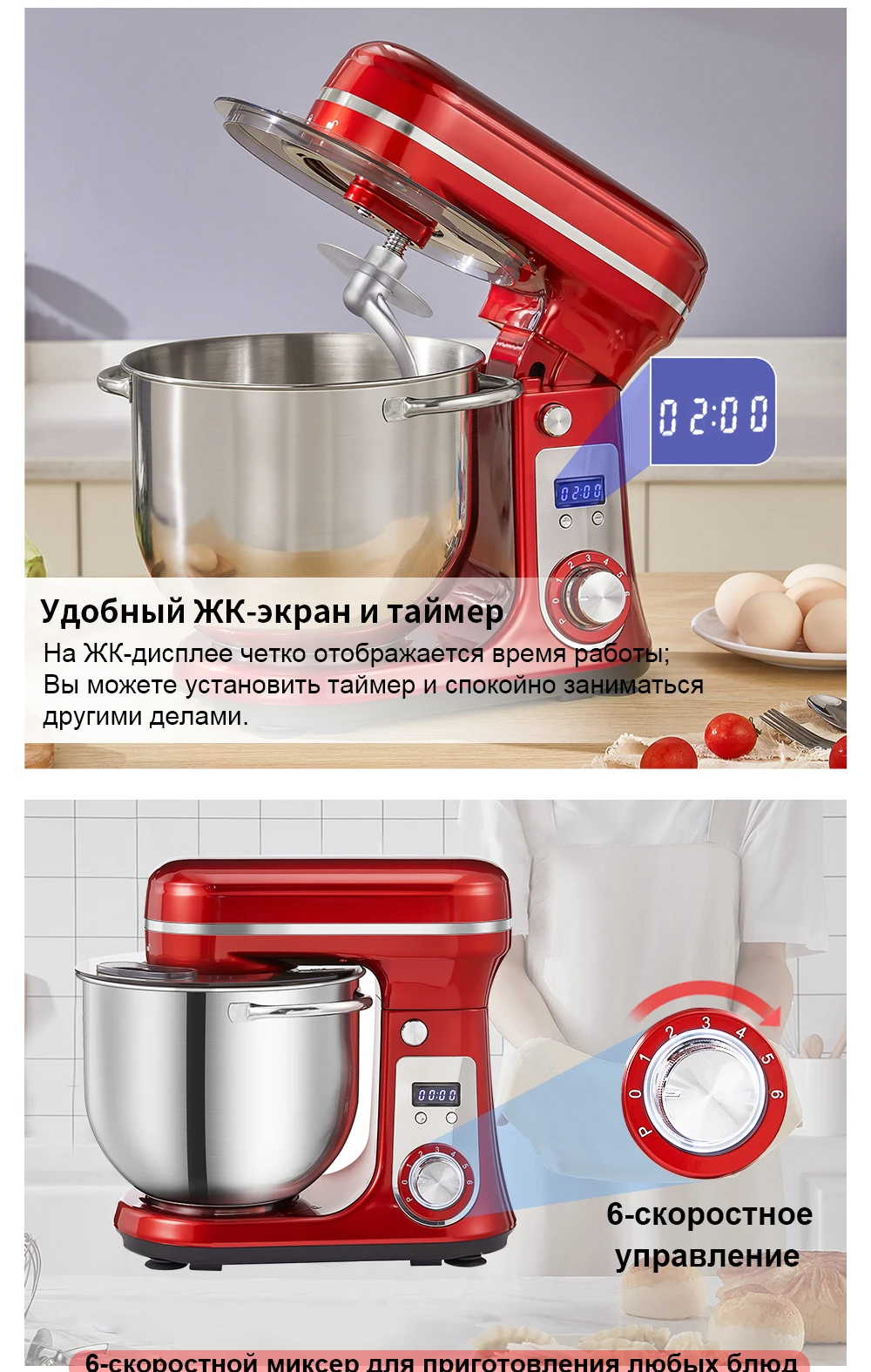 【Четкий светодиодный дисплей и дизайн наклонной головки】Смеситель для теста BioloMix оснащен цифровым дисплеем, показывающим время работы, что позволяет вам заниматься другими делами одновременно с работой миксера, что эффективно экономит ваше время. Наш многофункциональный миксер для выпечки также имеет встроенную защиту от перегрева и автоматически отключает машину при перегреве двигателя. Конструкция наклонной головки не только позволяет удобно переключать аксессуары, но и легко снимает чашу.