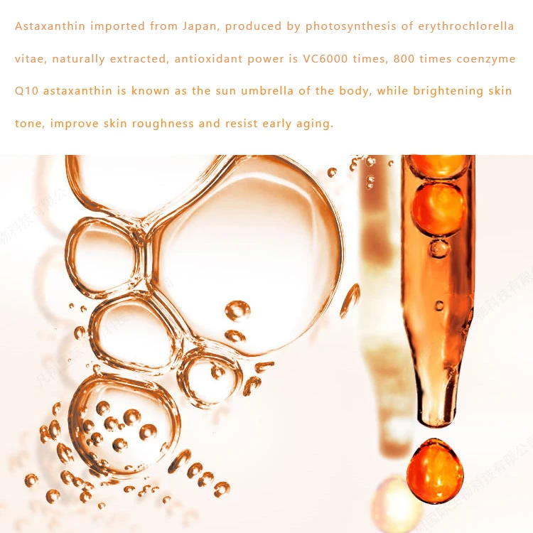 Astaxanthin импортируется из Японии, производится путем фотосинтеза эритрохлореллы vitae, естественно извлекается, антиоксидантная мощность VC6000 раз, 800 раз Коэнзим Q10, astaxanthin известен как Солнечный зонтик тела, В то время как осветление тона кожи, улучшает шероховатость кожи и сопротивляется раннему старению.