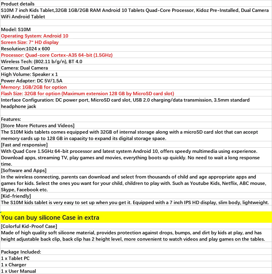 S10M7inchKidsTablet,32GB1GB/32Гб, KidozPre-установлен, DualCameraWiFiAndroidTablet