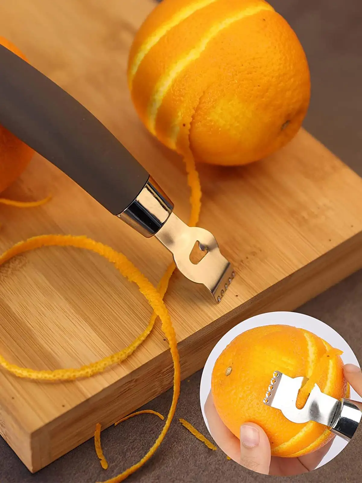 1.2 in 1 channel knife with five sharp scrap holes cuts away the pith and peel from lemons and other citrus fruits easily.