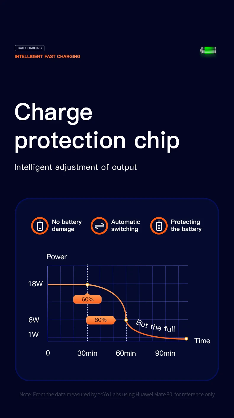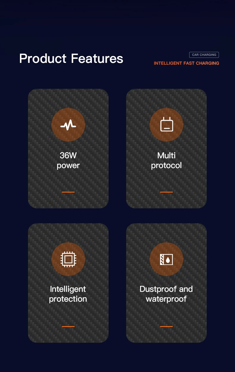 Двойные автомобильные розетки QC 3,0, общая мощность до 36 Вт. Он может заряжать два устройства одновременно на скорости QC3.0 от 0 до 80% за 35 минут. Обеспечивает 4-кратную скорость зарядки совместимых устройств.