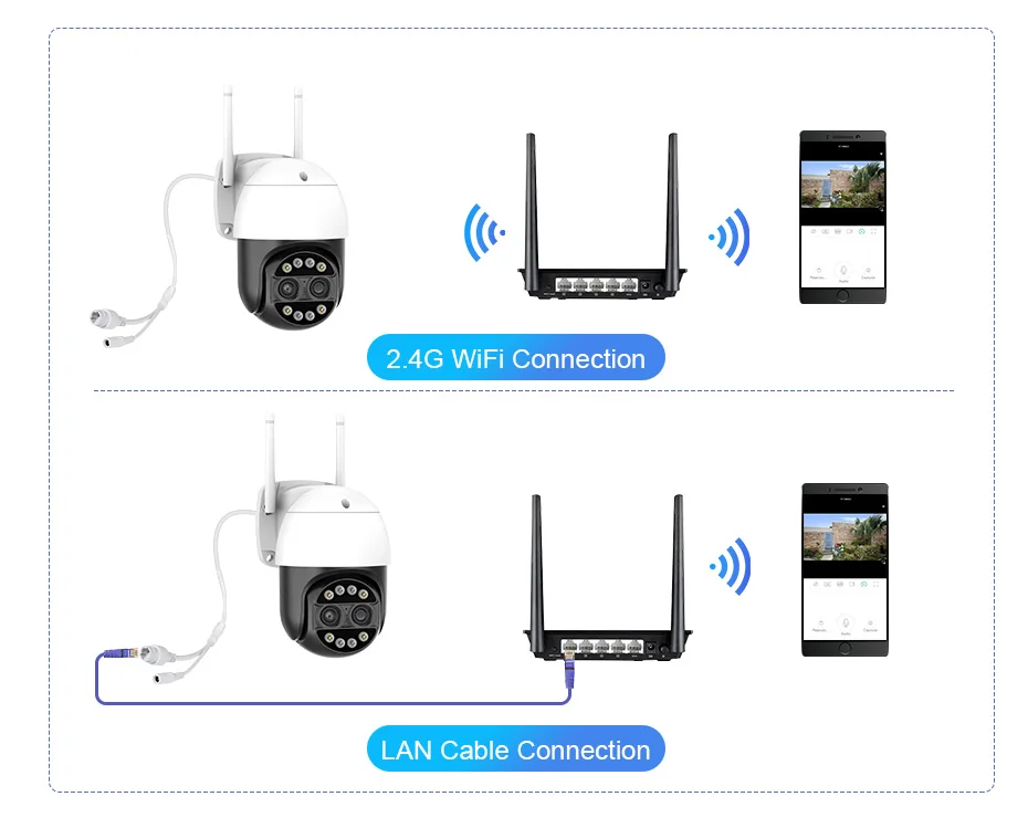 Питание от адаптера DC12V, вы можете подключить камеру к сети Wi-Fi. Вы можете настроить подключение к Wi-Fi камеры или поиск по локальной сети с помощью сетевого кабеля, подключенного к маршрутизатору, работает только с Wi-Fi 2,4G (не поддерживает 5G).