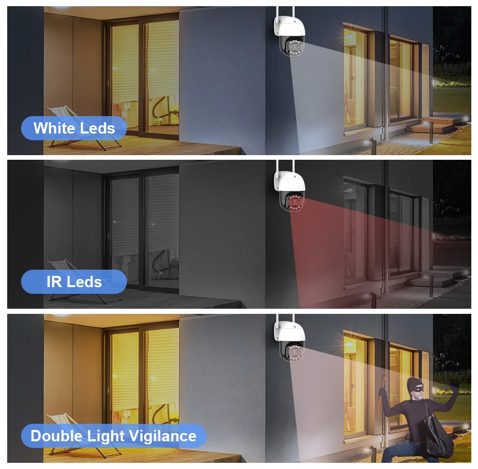 Встроенный 12 светодиодов, поддерживает полноцветный режим, инфракрасный режим и двойной светильник (инфракрасное ночное видение отображается при отсутствии движения объекта, И белый светильник будет включен, чтобы перейти в полноцветный режим после обнаружения движения).