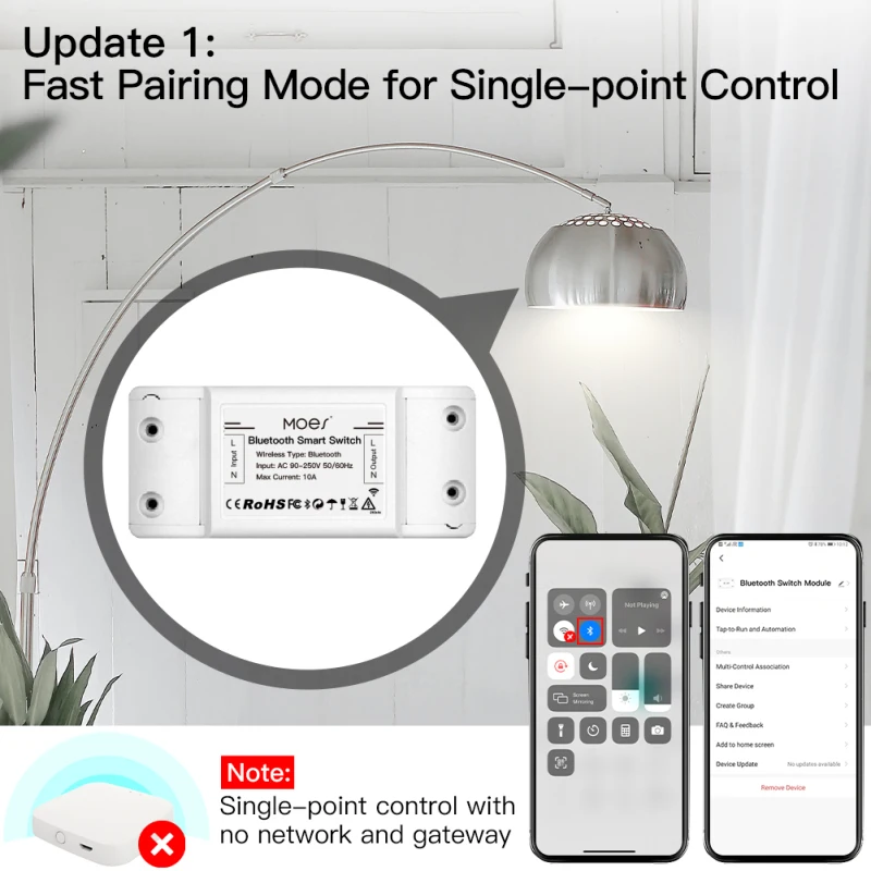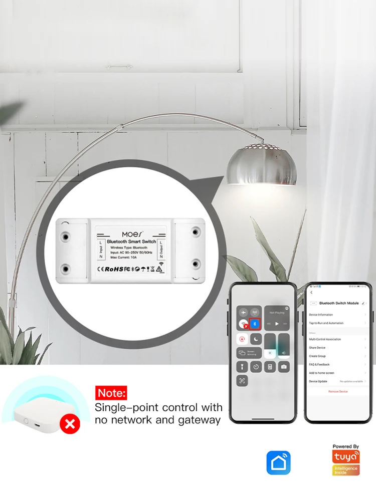 2.Wireless remote control and Alexa Google Home voice control are available with Bluetooth gateway connected,one-tap-to associate the switch module to Bluetooth gateway for various intelligent functions;Multi-control association enabled in Smart Life App for another controlling way without interference.