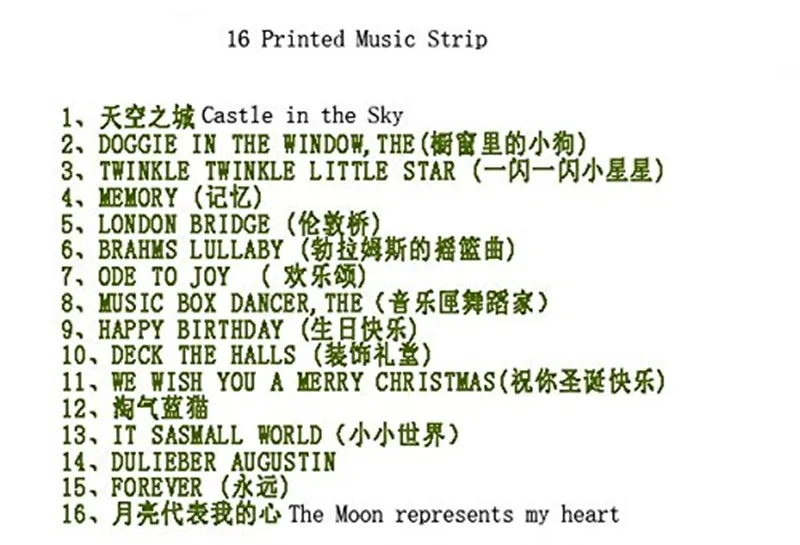Любите музыкальные коробки, но никогда не сможете найти нужную вам песню? Не смотрите дальше, с этим набором Механических Музыкальных коробок вы можете создать музыкальную коробку, которую вы всегда хотели. Музыкальная шкатулка управляется путем поворота рукоятки, так как музыкальная полоса питается через музыкальную коробку. В комплект входят 20 пустых музыкальных полосок и дырокол для того, чтобы написать свою собственную музыку за считанные минуты. Описание