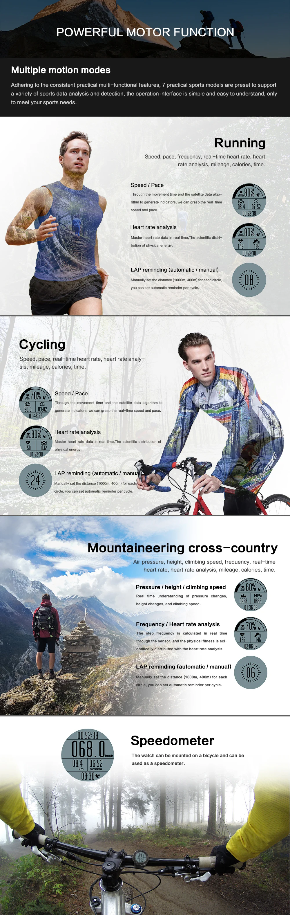 Главная страница: Время, дата; Сегодня номер шага + номер шага еженедельная Таблица; Электрокардиограмма (16 часов); Диаграмма давления (24 часа); Таблица температуры окружающей среды (24 часа); таблица высоты (24 часа) + Калибровка высоты; Компас; Уведомление Спортивный режим: Пешие прогулки/подъем (траектория, частота сердечных сокращений, частота, шаги, калории, высокое, давление, пробег, крупы); Бег (траектория, частота сердечных сокращений, частота, шаги, калории, скорость, темп, пробег, крупы); Езда на велосипеде (траектория, скорость, темп, частота сердечных сокращений, частота, шаги, калории, пробег, крупы); Ходьба (частота сердечных сокращений, частота, шаги, калории, пробег, кругов); IndoorRun (частота сердечных сокращений, частота, шаги, калории, пробег, крупы); Игры в мяч (пульс, калории, шары); Спидометр (скорость, темп, пробег); Секундомер; GPS: долгота и широта координат, мировое время/дата, высота, скорость движения; Запись круга: установка длины цикла; Режим Rcord ручной/автоматический; Частота сердечных сокращений: контроль режима ЭКГ 1 раз каждые 10 минут, 16 часов ЭКГ. Напоминание о сидячем положении; Мониторинг сна; Будильник