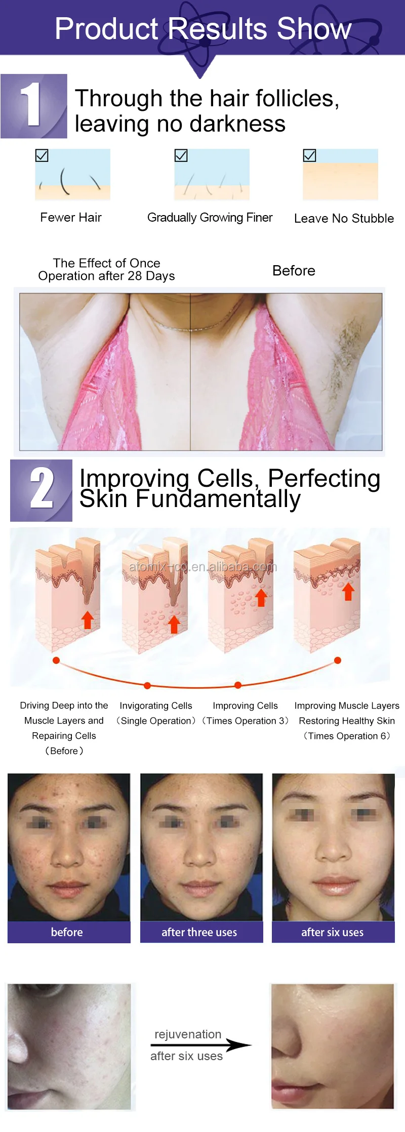 1). Постоянное удаление волос на всех типах кожи; Без боли, очень удобно во время лечения.