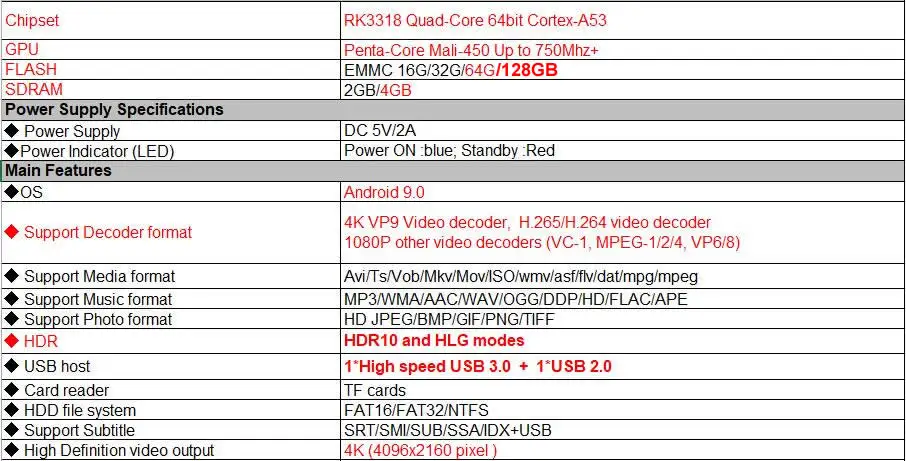-CPU: четырехъядерный процессор RK3318 64 бит Cortex-A53 -GPU: Penta-Core Mali-450 до 750 МГц + -ОЗУ: 2 ГБ/ 4 ГБ -ROM: EMMC 16 Гб/32 ГБ/ 64 Гб/128 ГБ -Android 9,0 OS -2,4G/5G двойной WIFI, BT4.0 -Поддерживает режимы 3D , 4K , HDR10 и HLG -USB 3,0, светодиодный дисплей Есть 4 варианта для HK1 MINI Plus: A: 2 Гб RAM + 16 Гб ROM + 2,4G и 5G Wifi +BT4.0 B: 4 Гб Оперативная память + 32 ГБ Встроенная память + 2,4G & 5G, Wi-Fi + BT4.0 C: 4 Гб RAM + 64 Гб ROM + 2,4G & 5G Wifi + BT4.0 D: 4 Гб RAM + 128 Гб ROM + 2,4G & 5G Wifi + BT4.0Демонстрация продукта: