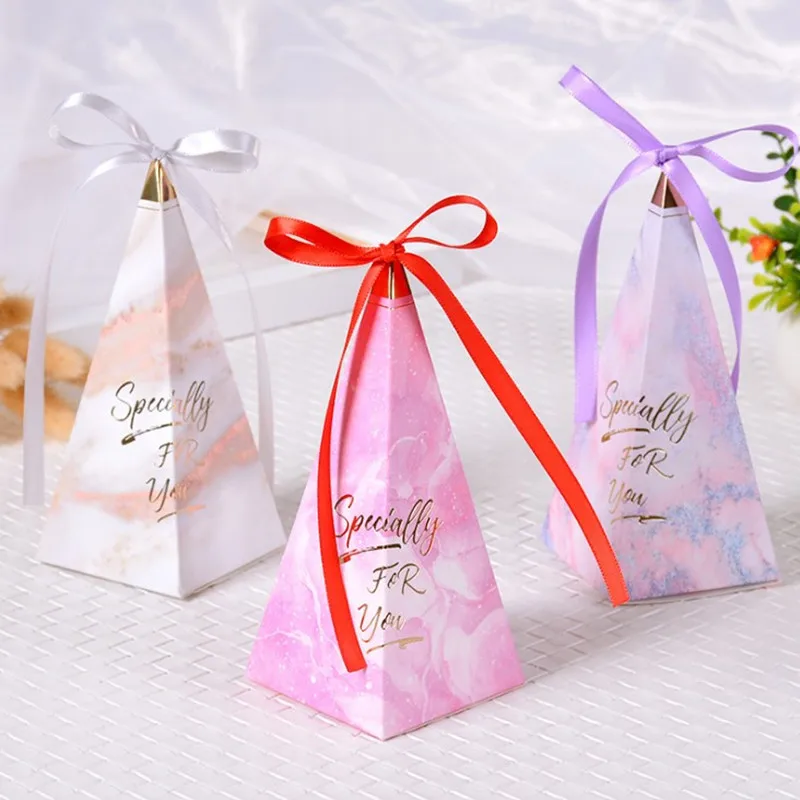 Упаковочный лист: 100 шт свадебные подарочные коробки Информация о продукте Размер: 14 см * 6 см * 6 см Цвет: розовый/светло-голубой/белый/розовый Материал: картон Количество: 100 шт конфетная коробка с лентами Вес: 8 г/за Узор: полигон/Пирамида Повод: Романтические свадебные украшения, детское украшение на день рождения, праздничные товары.