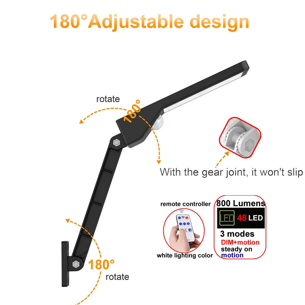 New 800 LM 48 LED Solar Power Street Light PIR Motion Sensor Lamps wall Lamp remote control rotate bracket ip65 for outdoor street garden yard pathway door etc, Gear lock